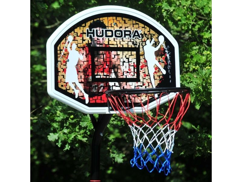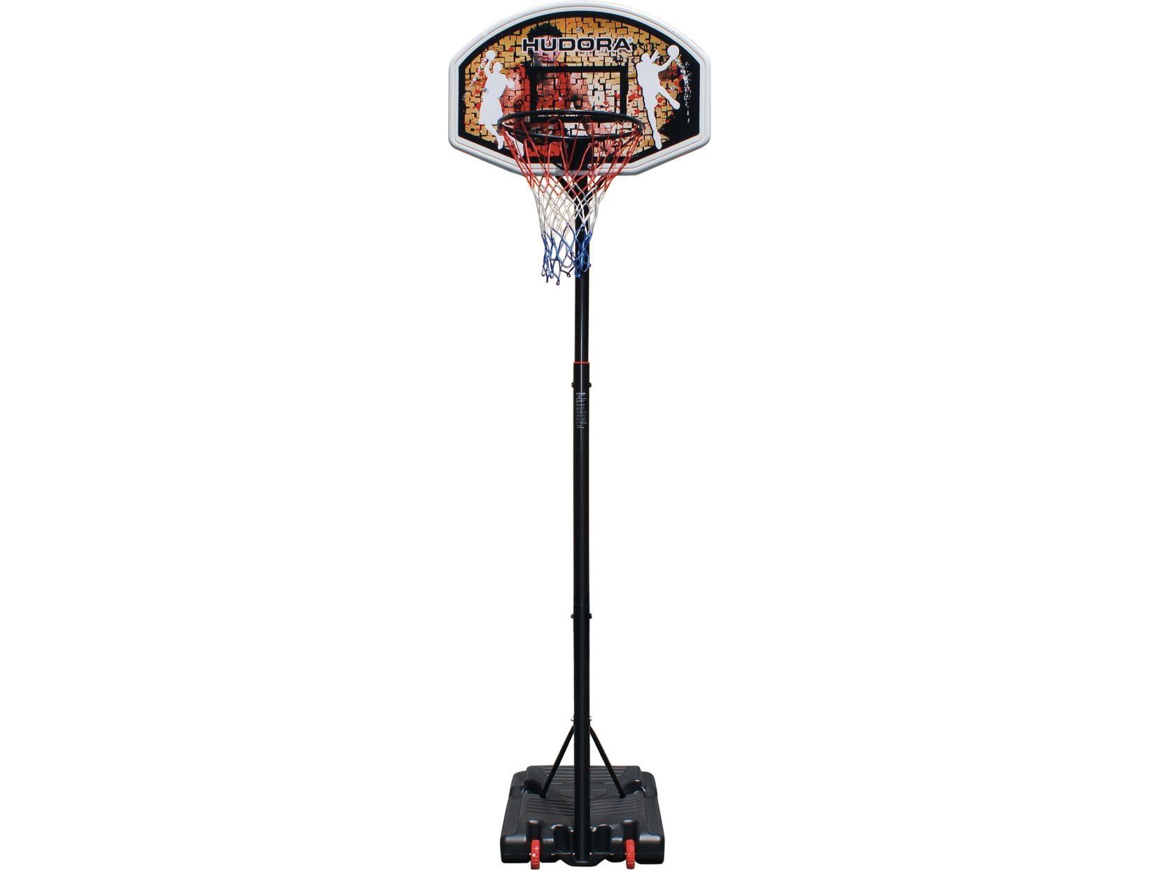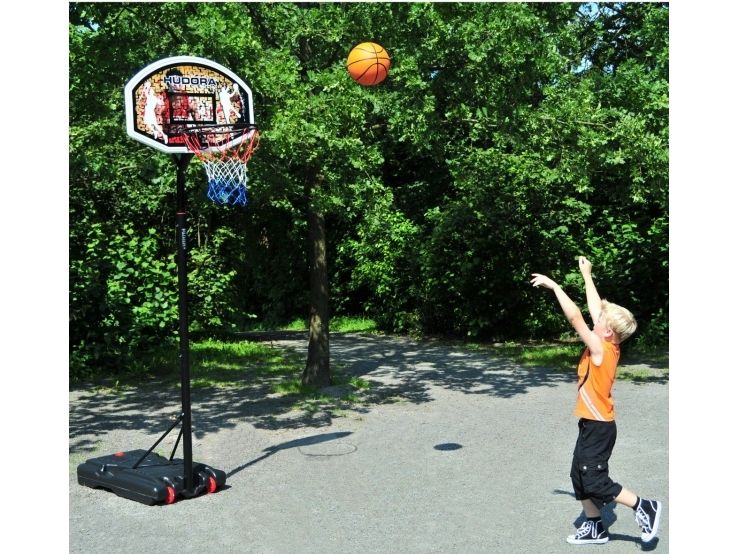 Outdoor Basketballständer für Kinder. Der transportable Ständer für Haus und Garten ist rollbar dank zwei Räder und höhenverstellbar von 206 bis 260 cm. Basketballbrett 90 x 60 cm, aus robustem ABS. Basketballkorb, bestehend aus pulverbeschichtetem Metallring in 1,6 cm Stärke und mit 45 cm Ringdurchmesser, mit Netzösen und 53 cm langem Netz. Metallstange in 50-58 mm Ø, pulverbeschichtet und mit zwei zusätzlichen Spannstangen am Standfuß befestigt. Sicherer Standfuß aus stabilem Vinyl. Wird für optimale Standsicherheit einfach mit Wasser oder Sand befüllt (ca. 60 l). Komplett mit allen nötigen Befestigungselementen.