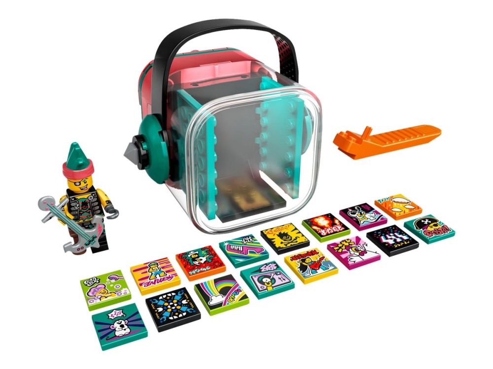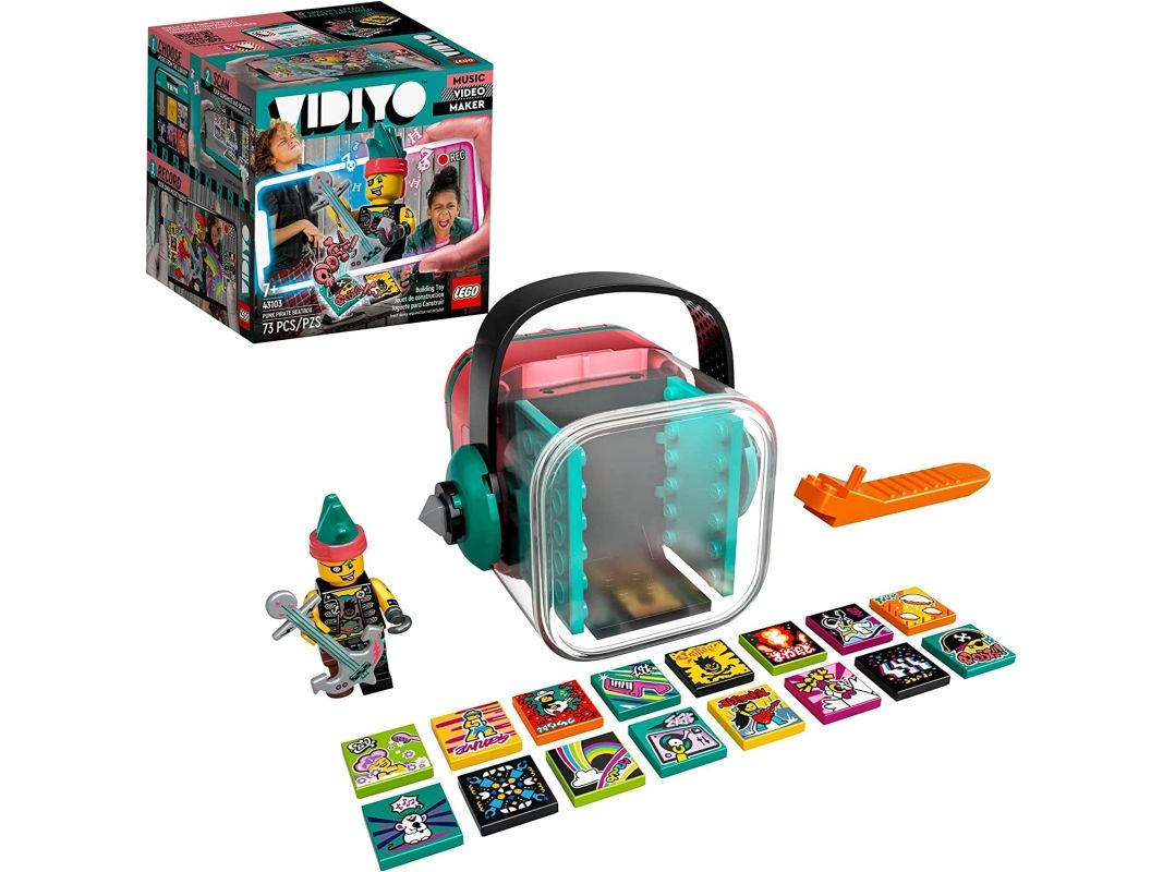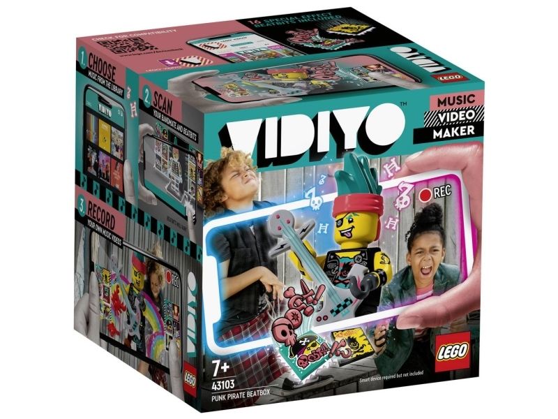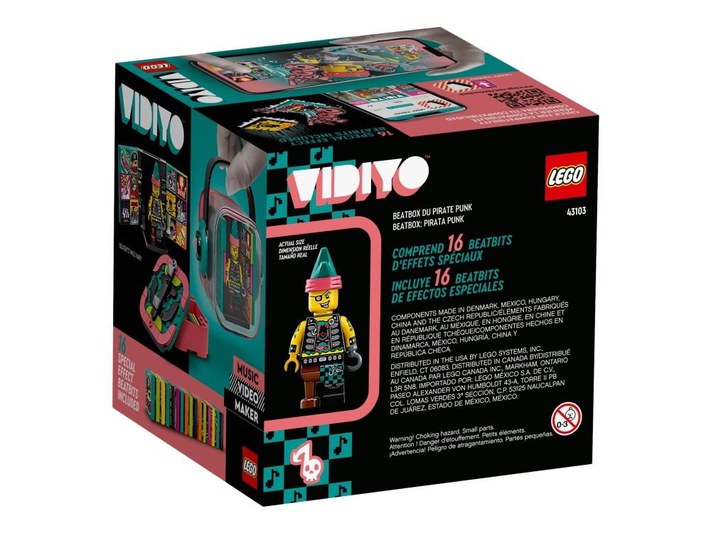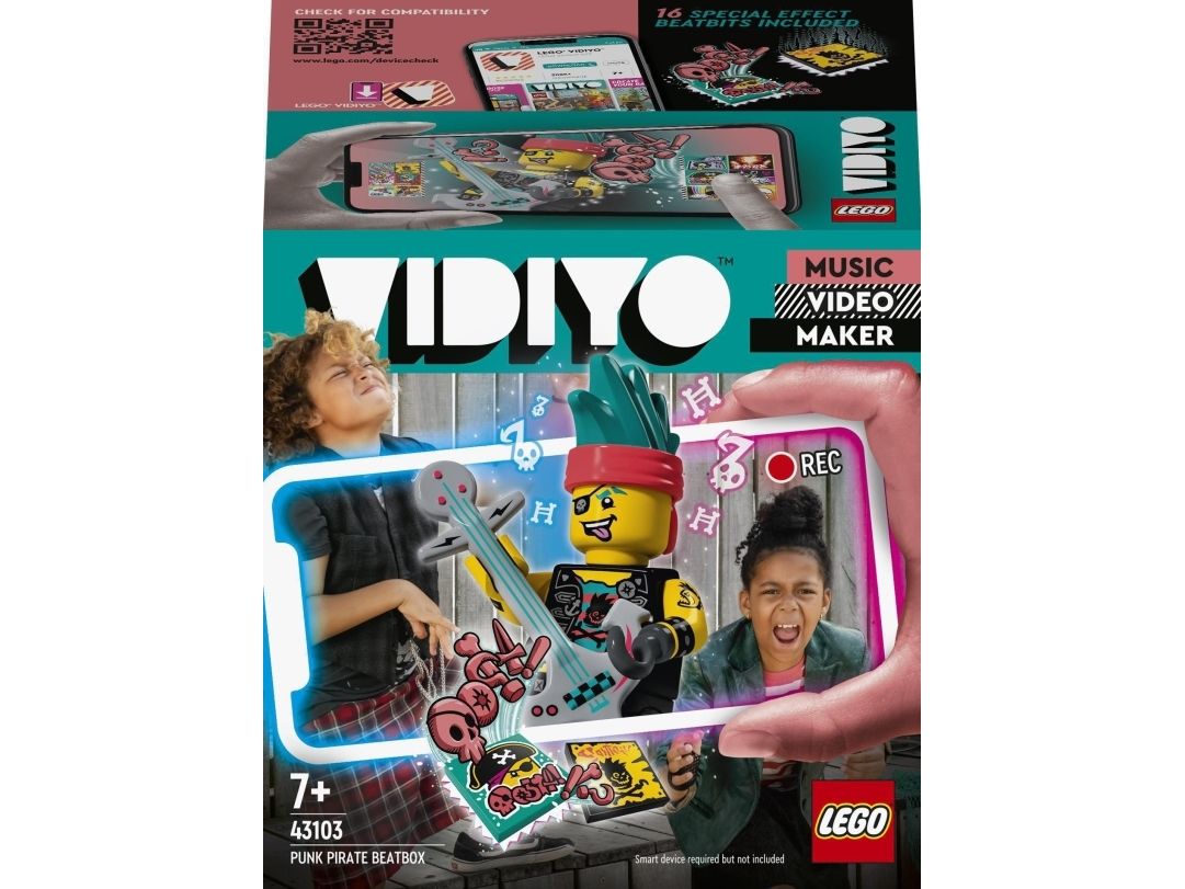 LEGO® VIDIYO™ 43103 Punk Pirate BeatboxMed LEGO® VIDIYO™ Punk Pater Beatbox (43103), og den tilhørende app kan børn optage deres egne musikvideoer og dele dem med andre børn på app Sættet indeholder en pirater-minifigur, 14 tilfældige Beatbits, to specielle beatbits samt den bærbare Beatbox. Download den gratis LEGO® VIDIYO™-app til at scanne minifiguren og Beatbits til fantastiske effekter. Børn vil elske at se, hvordan deres figur vågner til live i egen musikvideo. Gran Beatbits i app Sjov musikoplevelse for drenge og piger fra 7 år og derover, som fortjener en lille belønning. Dette legesæt er også en god gave til børn, som elsker musik, gerne danser og står op på scenen. Beatbox'en er 8 cm høj, 7 cm lang og 10 cm bred. Børn kan tage på tour med den bærbare, sammenklappelige Beatbox. I hver Beatbox passer scenen fra LEGO® klodser, 16 Beatbits