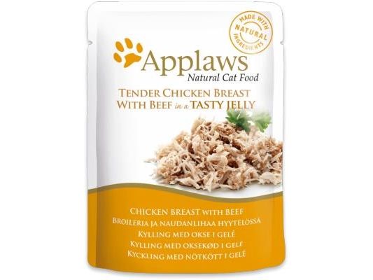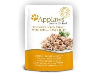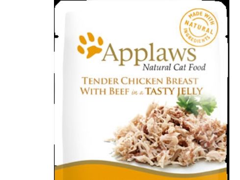 Description Applaws Chicken with Beef Jelly Pouch is a premium complementary cat food made using only the ingredients listed on the label. Each pouch is low in carbohydrate and contains 62% chicken fillet with beef so it's naturally high in protein and taurine helping to keep your cat healthy and happy.