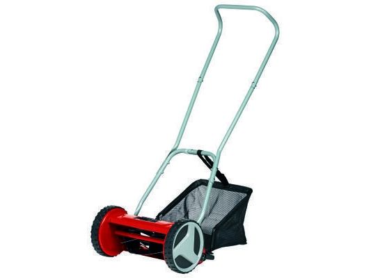 The Einhell GC-HM 300 cylinder lawn mower is a robust, functional lawn mower without a motor drive, for the clean, quiet and environment-friendly mowing of lawns of up to 150 m² in size. The ball-bearing mounted mower spindle with five high-grade steel blades is designed for a cutting width of 30 cm. The cutting height adjustment facility with 4 levels can be adjusted to individual requirements between 13 mm and 37 mm. The plastic roller has a diameter of 45 mm. The cylinder lawn mower has lawn-friendly large wheels. A curved long handle provides optimum on-the-job ergonomics, and there is a parking position for easy and secure storage of the lawn mower. The 16 liter grass catch basket is removable and easy to empty.