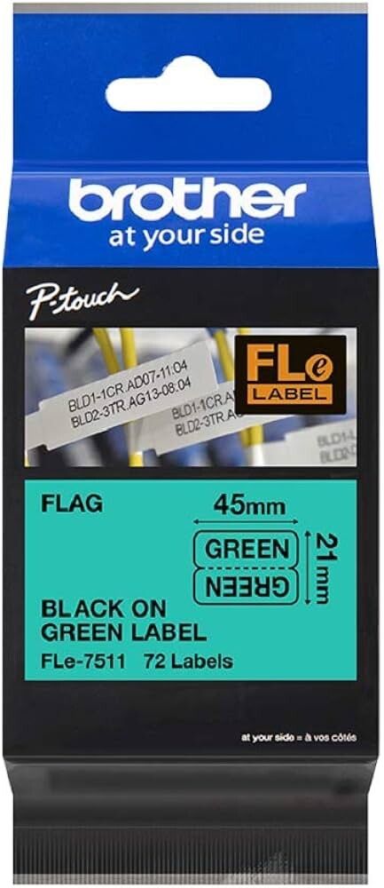 Das Original Brother FLe-7511 Schriftband mit schwarzer Schrift auf grünem Hintergrund ist für verschiedene Anwendungszwecke geeignet und kann unter anderem zur eindeutigen Identifikation von Kabeln verwendet werden. Auch im Einzelhandel sind die Einzelfähnchen-Etiketten ideal, um zum Beispiel Preise auszuzeichnen.