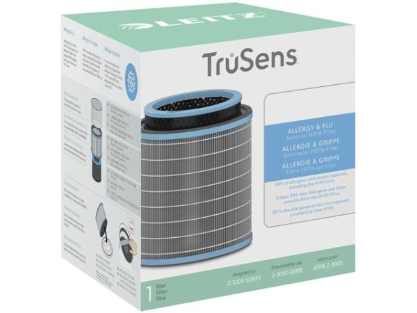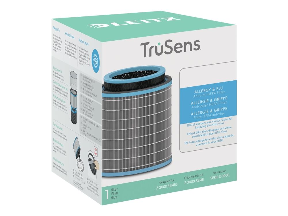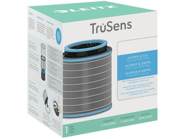 Help protect your family from the flu and year-round allergies with this all-in-one air purifier filter system. This combination filter has 3 levels of filtration to defend against flu viruses and pollutants in the air; a durable mesh pre-filter, an anti-viral HEPA filter and an activated carbon pellet filter. The filter drum is at the core of purifying your air as it captures 99.97% of airborne allergens and viruses, including the H1N1 virus. To keep your air purifier performing at its best, it's recommended to replace the HEPA filter drum every 12 months (depending on usage). Compatible with all Leitz TruSens Z-3000 Large air purifiers.