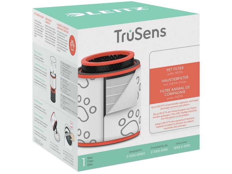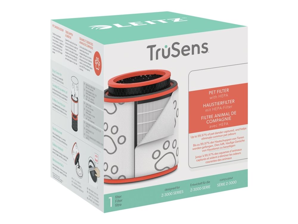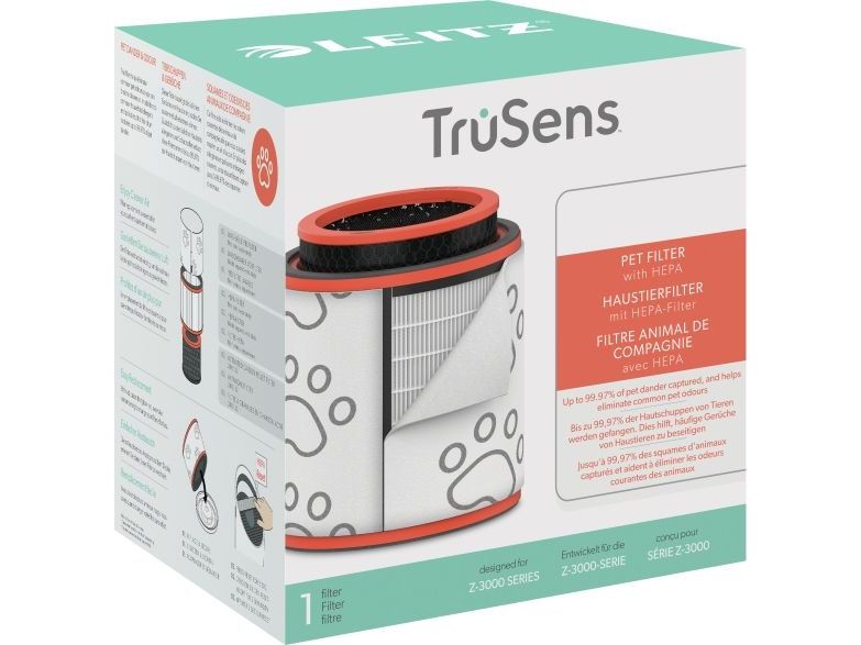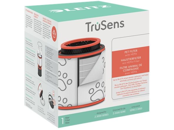 Breathe cleaner air with a filter that helps eliminate pet dander & odours. This combination filter has 3 levels of filtration formulated specifically to combat pet odours, dander, pet hair and dust. The all-in-one filter system combines a washable prefilter, a HEPA filter and a 2-layer carbon pellet filter. In addition to common household allergens and pollutants, this filter drum captures 99.97% of airborne pet dander. The filter drum is at the core of purifying your air. To keep your air purifier performing at its best, it's recommended to replace the HEPA filter drum every 12 months (depending on usage). Compatible with all Leitz TruSens Z-3000 Large air purifiers.
