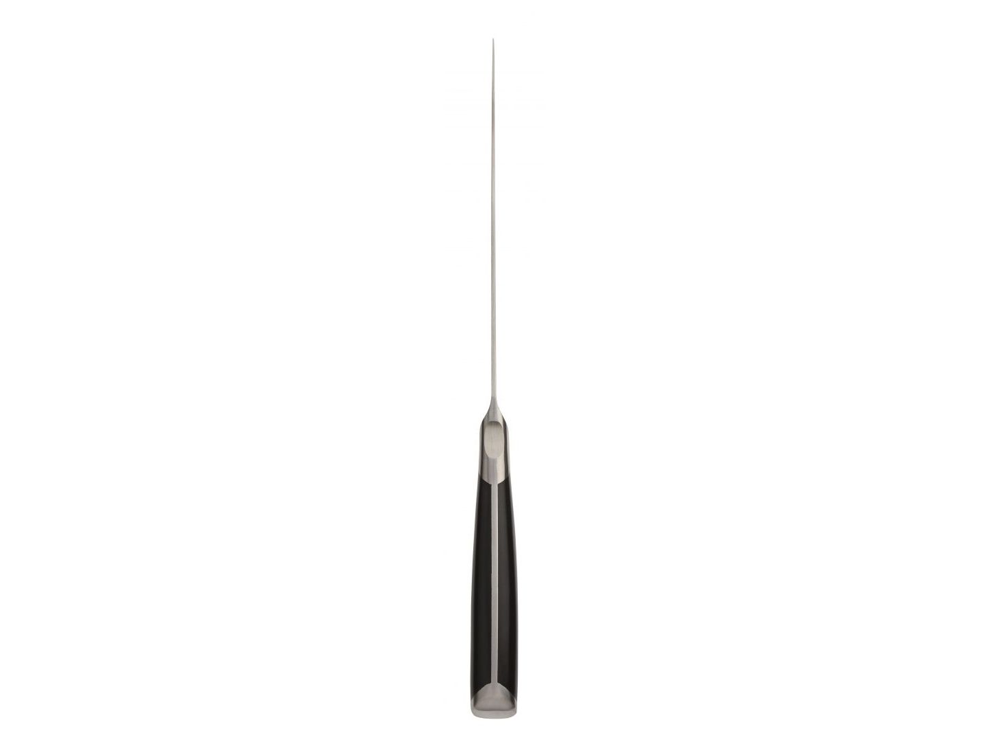 Denne universalkniv er smedet af tysk rustfrit stål med en skarp 15° konusslebet skærkant og leverer overlegen skæreydelse, der holder. Det robuste tyske rustfrit stål kan modstå selv de hårdeste produkter. Bladet er ishærdet for forbedret kantfastholdelse, så kniven forbliver skarpere i længere tid og giver højere modstandsdygtighed over for korrosion og sløvning En fuld tangkonstruktion betyder, at kniven er formet og vægtet for optimal balance, hvilket giver den ultimative komfort og smidighed i brug, for træthedsfrit og sikkert arbejde med kniven. Håndtaget er designet til at passe til enhver håndstørrelse og grebsstil og har en ergonomisk konisk bolster med en flad fingerstøtte på rygsøjlen for præcis og behagelig brug Hver kniv har unikke berøringspunkter designet til at arbejde sammen med kokken. En fingerstyring på ryggen af den koniske styrke til balance, kontrol og præcisionsskæring og en fingerfordybning oven på bladet giver en behagelig og sikker position til placering af fingre, når du hugger sten, eller når der kræves ekstra kraft for at trykke ned på hårdere produkter. Med et rust- og korrosionsbestandigt blad og antibakterielt håndtag rengøres denne kniv let i opvaskemaskinen