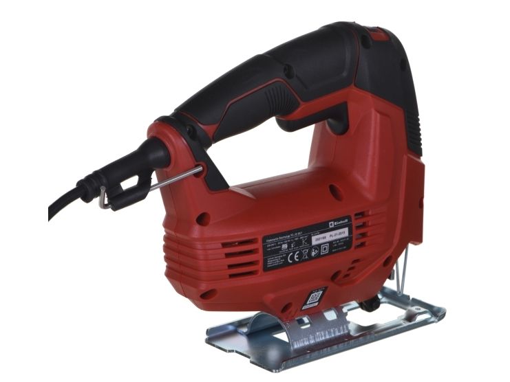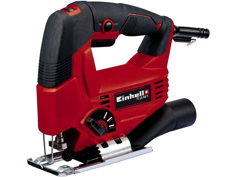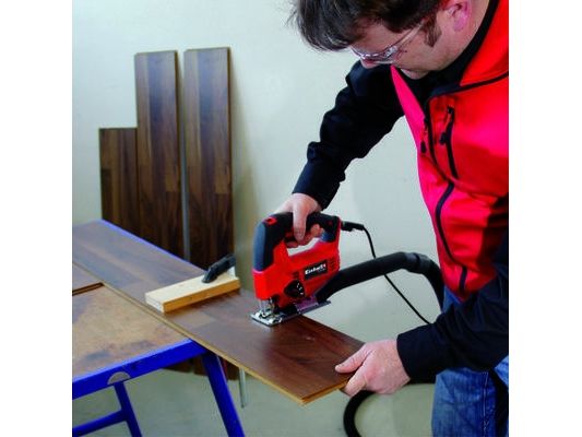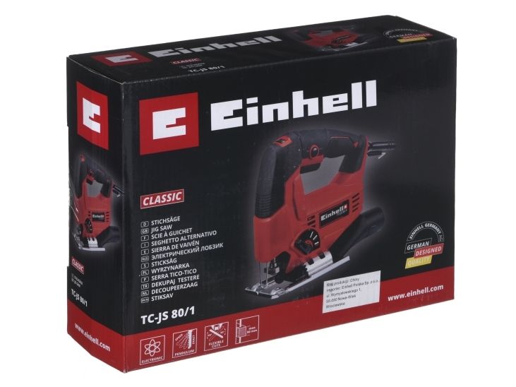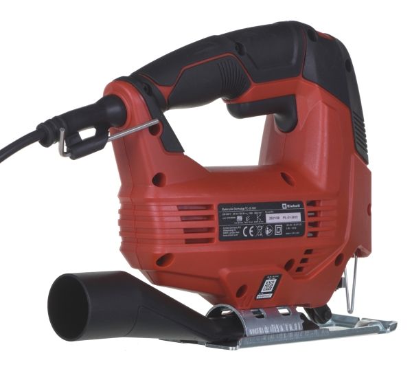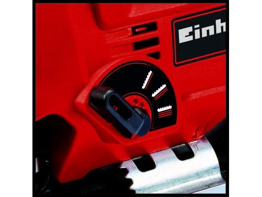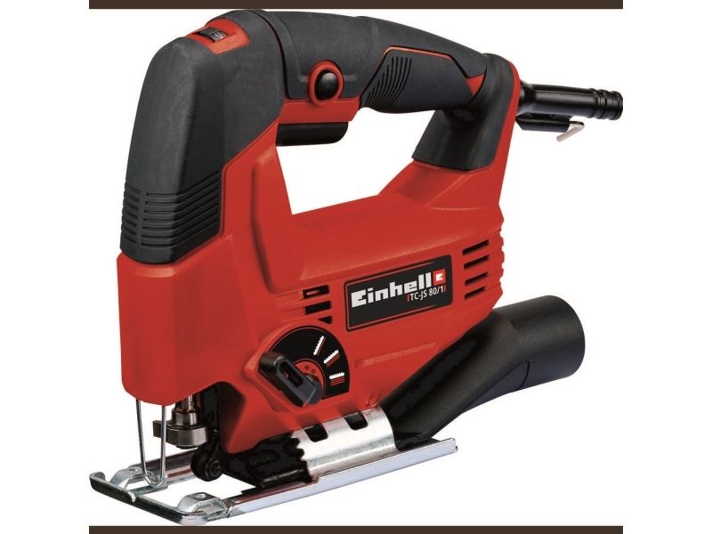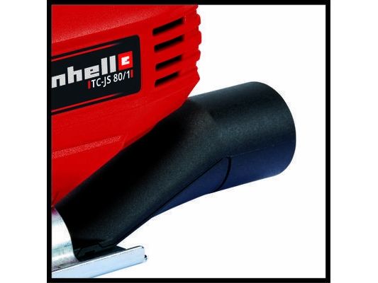 The Einhell TC-JS 80/1 jigsaw is the ideal tool for performing cutting work in the workshed, garage and the DIY enthusiast’s cellar. It has a 550 W motor for plenty of power. Whether for wood, plastic or even steel, it effortlessly tackles a wide variety of materials. The four-setting pendulum action enables exact and fast cuts to be performed. On wood the jigsaw can be used to cut to a depth of 80 millimeters. On plastic it permits a cutting depth up to 20 millimeters and on steel up to 10 millimeters with the minimum of effort. Softgrip surfaces make the Einhell TC-JS 80/1 jigsaw fit comfortably in the hand, making it pleasant to work with. The soleplate can be swiveled and allows miter cuts at angles of up to 45 degrees. The dust extractor keeps the work area clean. The saw blade can be changed quickly and effortlessly without the need for any tools whatsoever.