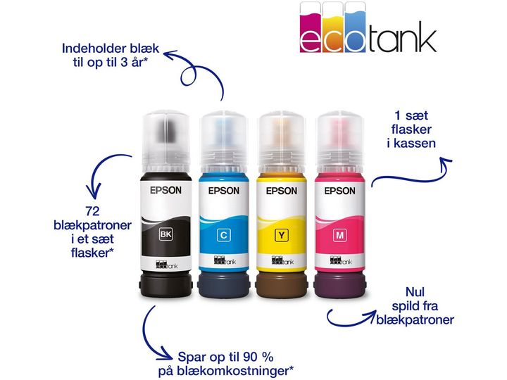 Erhebliche Kostenersparnisse Mit diesem sparsamen Drucker reduzieren Sie Ihre Tintenkosten um bis zu 90 %.1 Im Lieferumfang enthalten ist ein Tintenvorrat für bis zu 3 Jahren.2 Ein Tintenflaschen-Set reicht für bis zu 4.500 Seiten in Schwarzweiß und 7.500 Seiten in Farbe.3 Das entspricht der beeindruckenden Zahl von bis zu 72 Tintenpatronen!1
