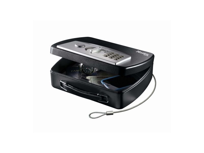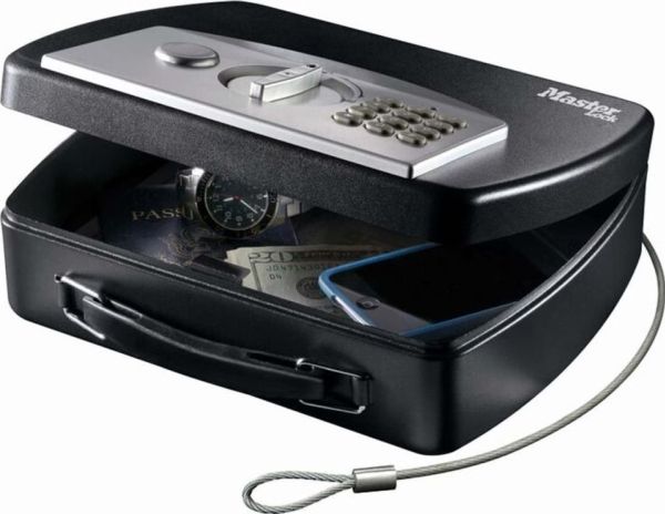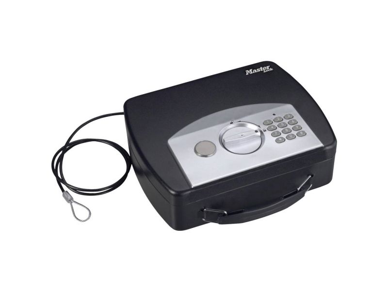 Master Lock Lockbox für unterwegs P008EMLStahlkonstruktionDokumentenboxen können mit einem Stahlkabel an einem Objekt auf dem Boden befestigt werdenDigitale Kombination mit Verzögerungsmodus nach Eingabe mehrerer falscher ZugangskombinationenDigitale Kombination mit Hauptschlüssel: 2 einstellbare Kombinationen - 2 Schlüssel im Lieferumfang enthaltenDer Boden der Box ist aus SchaumstoffKabel 88 cm x 4 mm DurchmesserGriffBenötigte Batterien: 4x Typ LR6/AA (nicht im Lieferumfang enthalten) Master Lock Lockbox für unterwegs P008EML Die kleine Dokumentenbox Master Lock Nr. P008EML mit digitalem Kombinationsschloss ist ideal für die Sicherheit unterwegs.move.