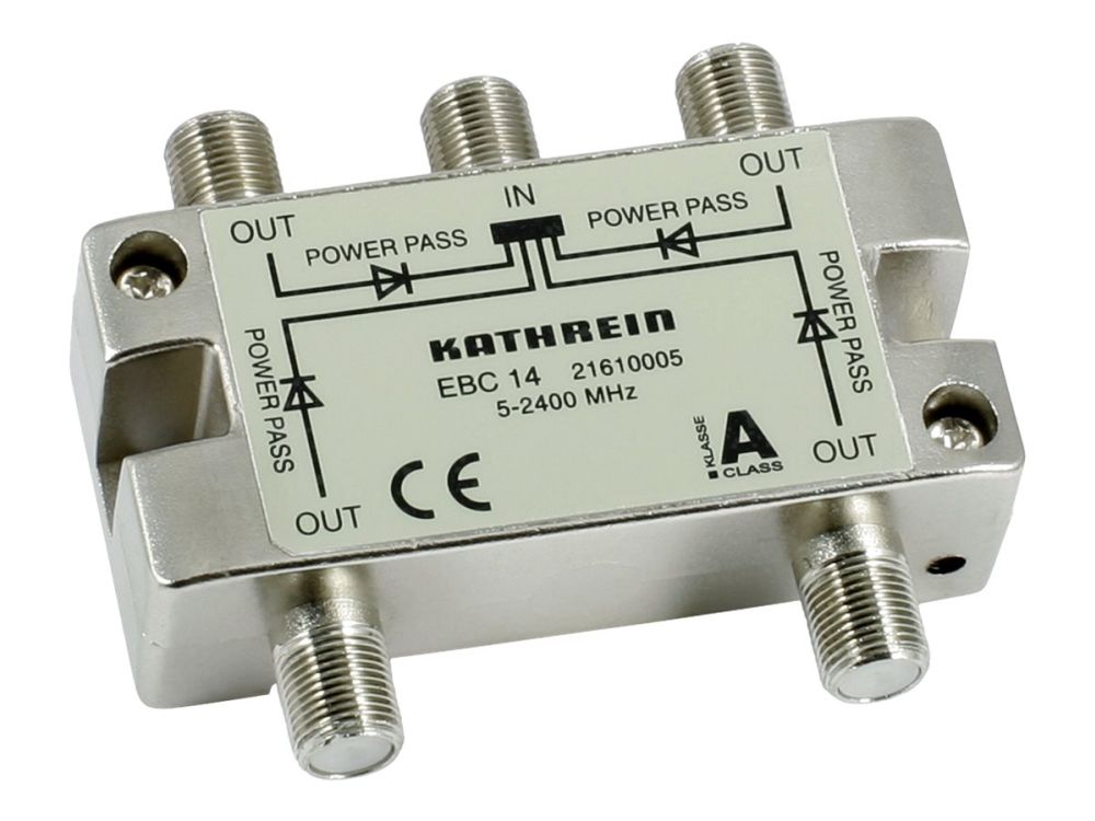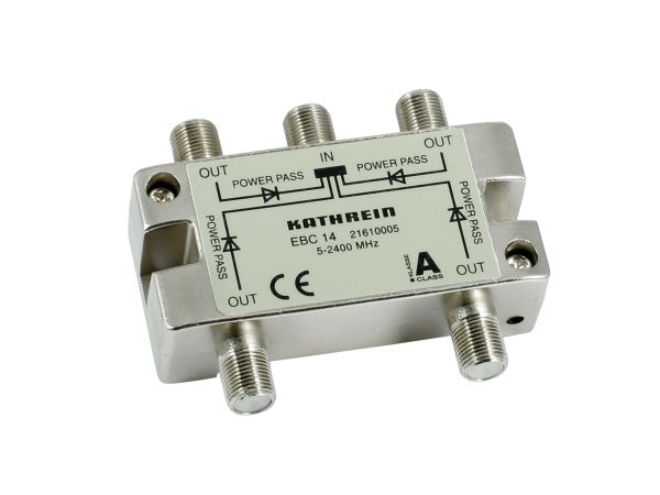 4fach-F-Verteiler 5-2400 MHz, Schirmklasse A, Anschluss für Potenzialausgleich, Fernsp. max. 24 V/0,5 A (4 Ausg.), Entkopplungsdioden OUT->IN Durchgang: 5-47/862/2150/2400MHz:11/10/11,5/13,5dB Entkoppl.5-47/-862/-2150/-2400MHz:10/20/20-15/10dB