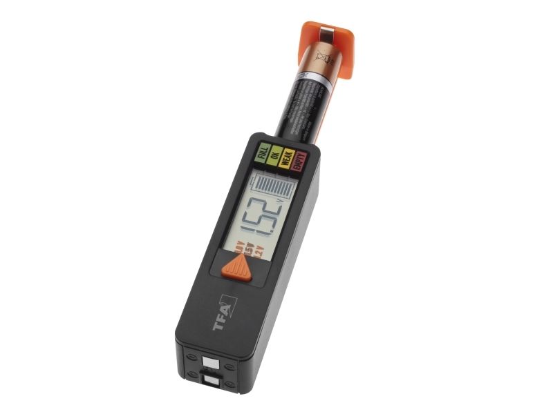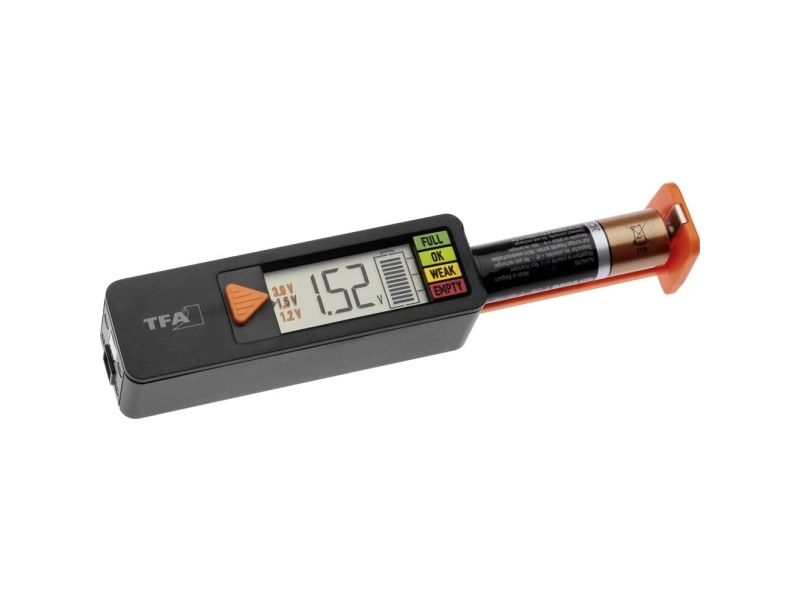 Batteritester battericheck 98.1126 .01Hurtig og nem kontrol af ladetilstanden Beregnet til batterier og genopladelige batterier (type AAA, AA, C, D) og knapceller med 1,2 V / 1,5 V / 3,0 V og 9 V batterier Angivelse af den resterende batterispænding i volt og ladestatus med farvet skalering Kompakt og robust Kræver ikke eget batteriLille, kompakt og robust og kan anvendes til hurtig kontrol af batterier: Batteritester battericheck. Batteritesteren er egnet til de mest almindelige batterityper (type AAA, AA, C, D), knapcellebatterier (med 1,2 V / 1,5 V / 3,0 V) og 9 V-batterier. Da batterityCheck til kortvarig måling benytter energien fra det batteri, der skal testes, behøver den ikke sin egen strømforsyning og er altid klar til brug. Ved visning af opladningsstatus og batterispænding i volt kan du hurtigt og nemt bestemme, om batteriet har nok P