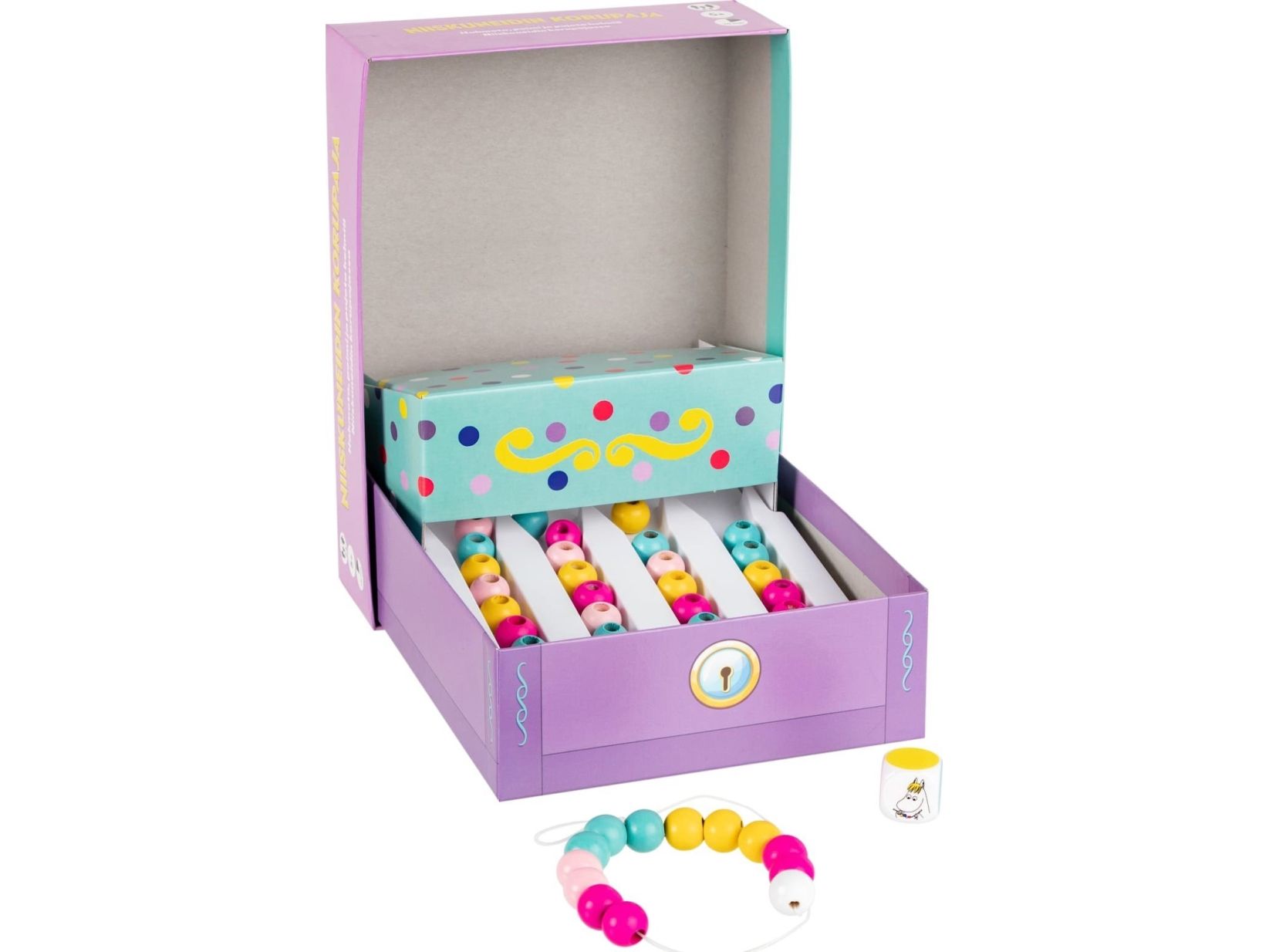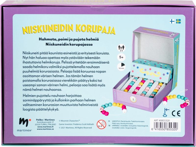 Snorkfrøkenen liebt schöne Dinge, vor allem Schmuck. Jetzt will sie ihren Freunden beibringen, wie man schönen Perlenschmuck herstellt. Ziel des Spiels ist es, als Erster ein Perlenarmband zu vervollständigen, indem man Perlen aus der Schmuckschatulle auf eine Schnur auffädelt. Das Auffädeln der Perlen trainiert die Geschicklichkeit und das Nachvollziehen der Konsequenzen des eigenen Handelns das logische Denken. Regeln auf Finnisch, Schwedisch, Englisch und Norwegisch. 2-4 Spieler, 10 Min., 5+