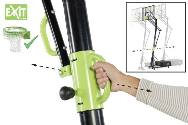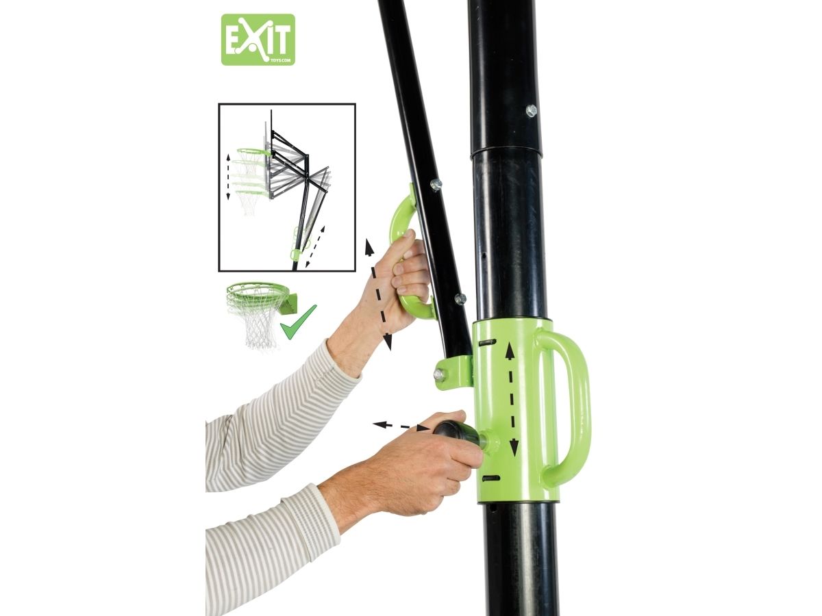 Der Galaxy Korb hat ein einzigartiges System, womit der Korb ein einigen Sekunden in der gewünschten Höhe eingestellt werden kann. Man zieht den Bedienungsknopf und mit dem grünen Griff schiebt man das System in der gewünschten Höhe. Der Bedienungsknopf verriegelt sich automatisch. Dafür braucht man eigentlich sehr wenig Kraft, wobei sogar Kinder die genaue Höhe selber einstellen können. Auf diese Weise kann jedes Moment die richtige Höhe gewählt werden, ob nun kleine Kinder, oder Erwachsene Basketball spielen wollen.