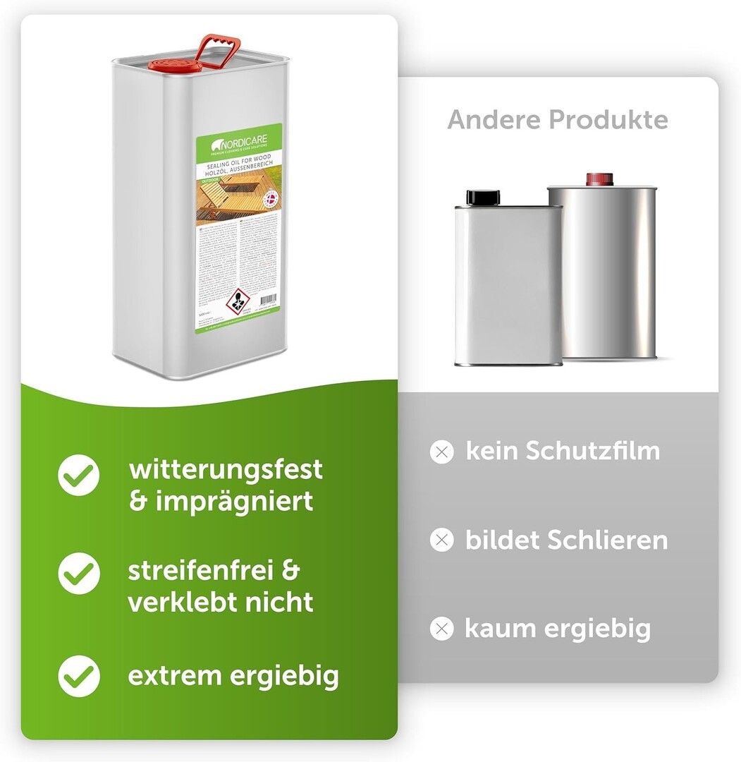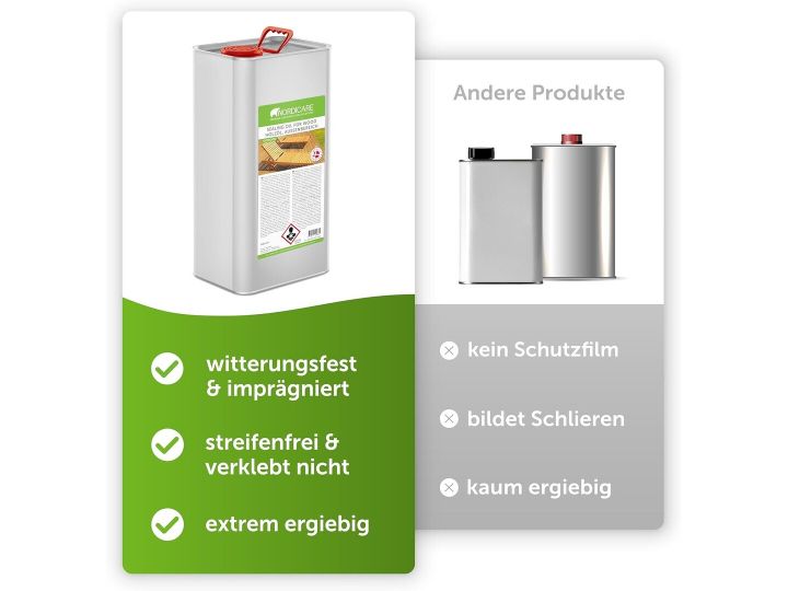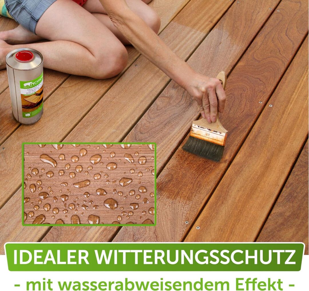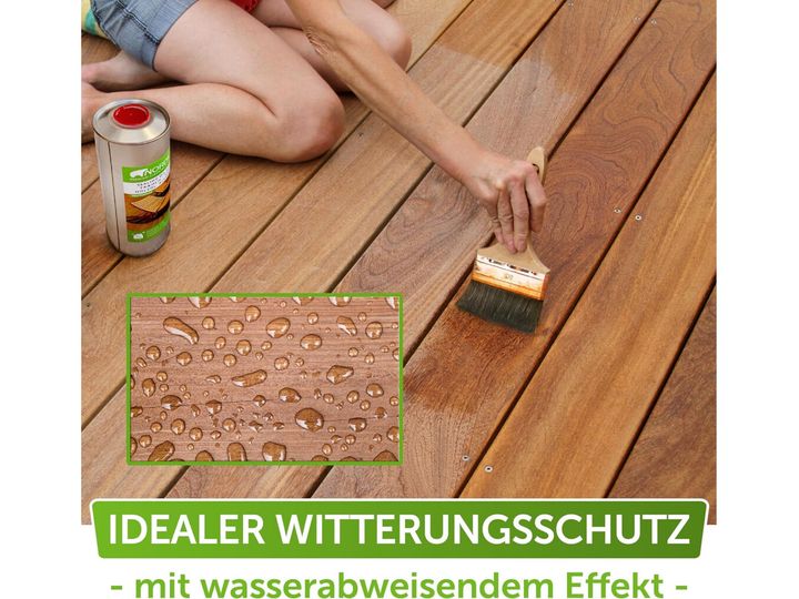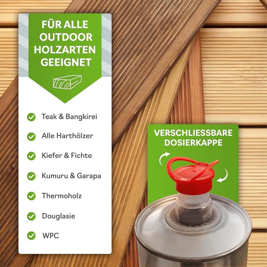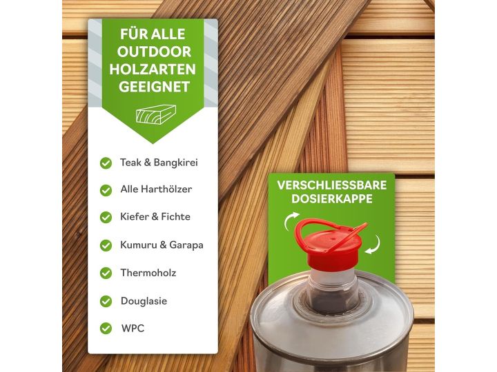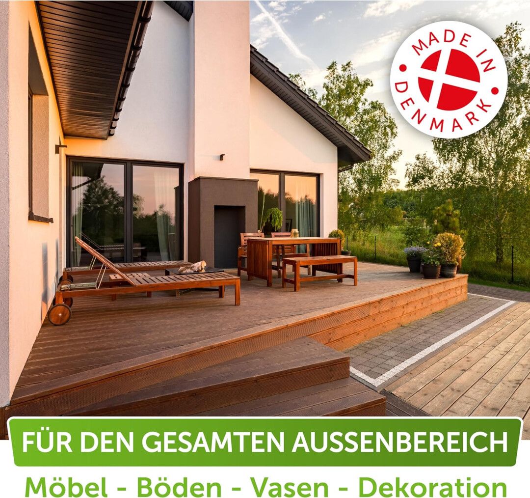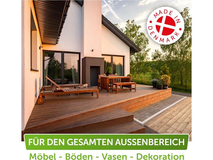 HOLZÖL für den Außenbereich wurde zur Behandlung und Pflege von Holzoberflächen bei Gartenmöbeln und Terrassen sowie anderen unbehandelten oder ölbehandelten Holzelementen entwickelt. Das Öl dringt in die Oberfläche ein und versiegelt sie. Das Holz erhält dadurch einen dauerhaften Schutz vor Austrocknung, Feuchtigkeit, Schmutz, Verrottung und Schimmel. Gleichzeitig betont das Öl die natürliche Farbe und Textur des Holzes.