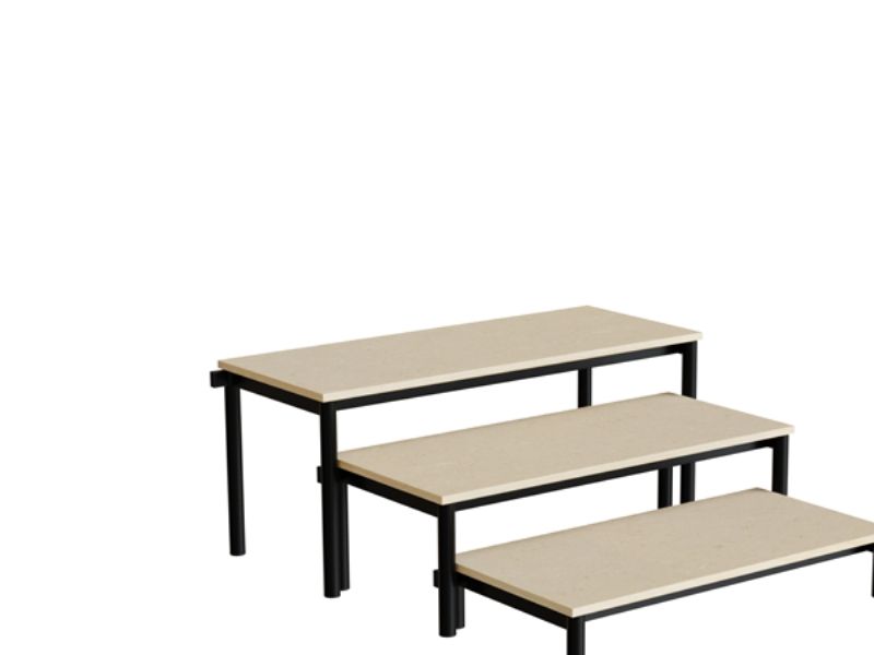 Idol-Bank als Treppenmodul. Sitzfläche mit Linoleum bezogen. Gestell aus lackiertem Stahl Ø40 mm mit Auszugssperre. Dreiteilig.