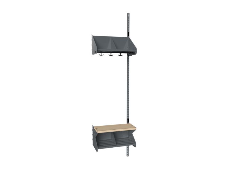 BST-Kombination G. Garderobenanbauelement mit 2 Sitzplätzen und Bank. Hut- und Schuhablage mit Trennwänden aus pulverbeschichtetem dunkelgrauem Metall, RAL 7012. 1 Wandschiene und Garderobenstange mit 6 Ankerhaken. Sitzbreite 250 mm und Gesamtbreite 515 mm. Bank mit Sitzfläche aus Birken-Hochdrucklaminat.