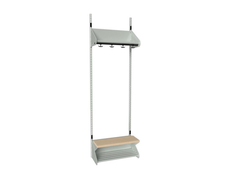 BST-Kombination H. Garderobenerweiterung mit 3 Sitzplätzen und Bank. Hut- und Schuhablage ohne Trennwände aus pulverbeschichtetem Metall, weiß RAL 9010. 1 Wandschiene und Garderobenstange mit 9 Ankerhaken. Sitzbreite 250 mm und Gesamtbreite 764 mm. Bank mit Sitzfläche aus Birken-Hochdrucklaminat.
