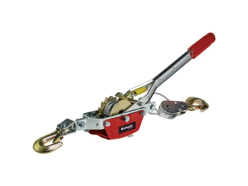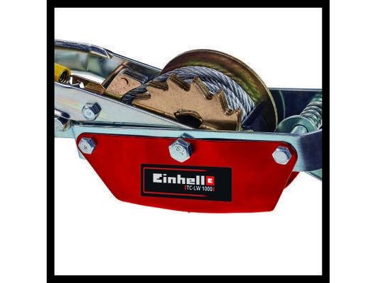 The Einhell TC-LW 1000 hand lever winch takes the strenuous effort out of moving building materials and heavy products. The hand lever winch is suitable for pulling and tensioning loads. With a maximum tensile load of 1000 kg and a maximum useable distance of 1.2 meters, it can be used for moving solid wood burning stoves, kitchen equipment and machines as well – with zero back pain. The product is supplied with a 2.2 meter twist-free wire cable (Ø 4.8 mm) and a guide roller with load hook which has a retention latch. The retention latch prevents the load from being unhooked accidentally. An automatic brake secures the load in every position. There is a safety clip to prevent a complete unrolling of the cable. The winch comes with a tensioning spring for releasing the retaining catch easily. The hand lever winch is not suitable for lifting and lowering loads.