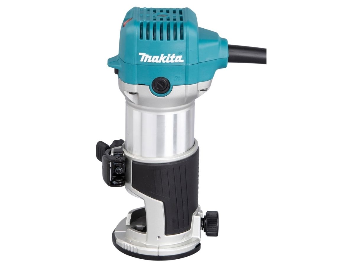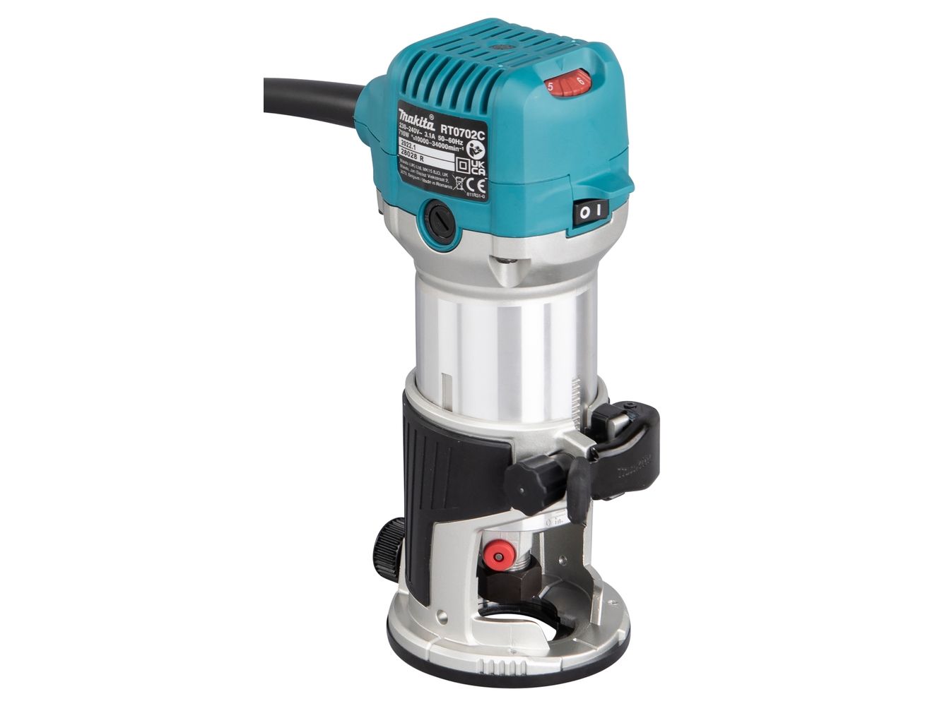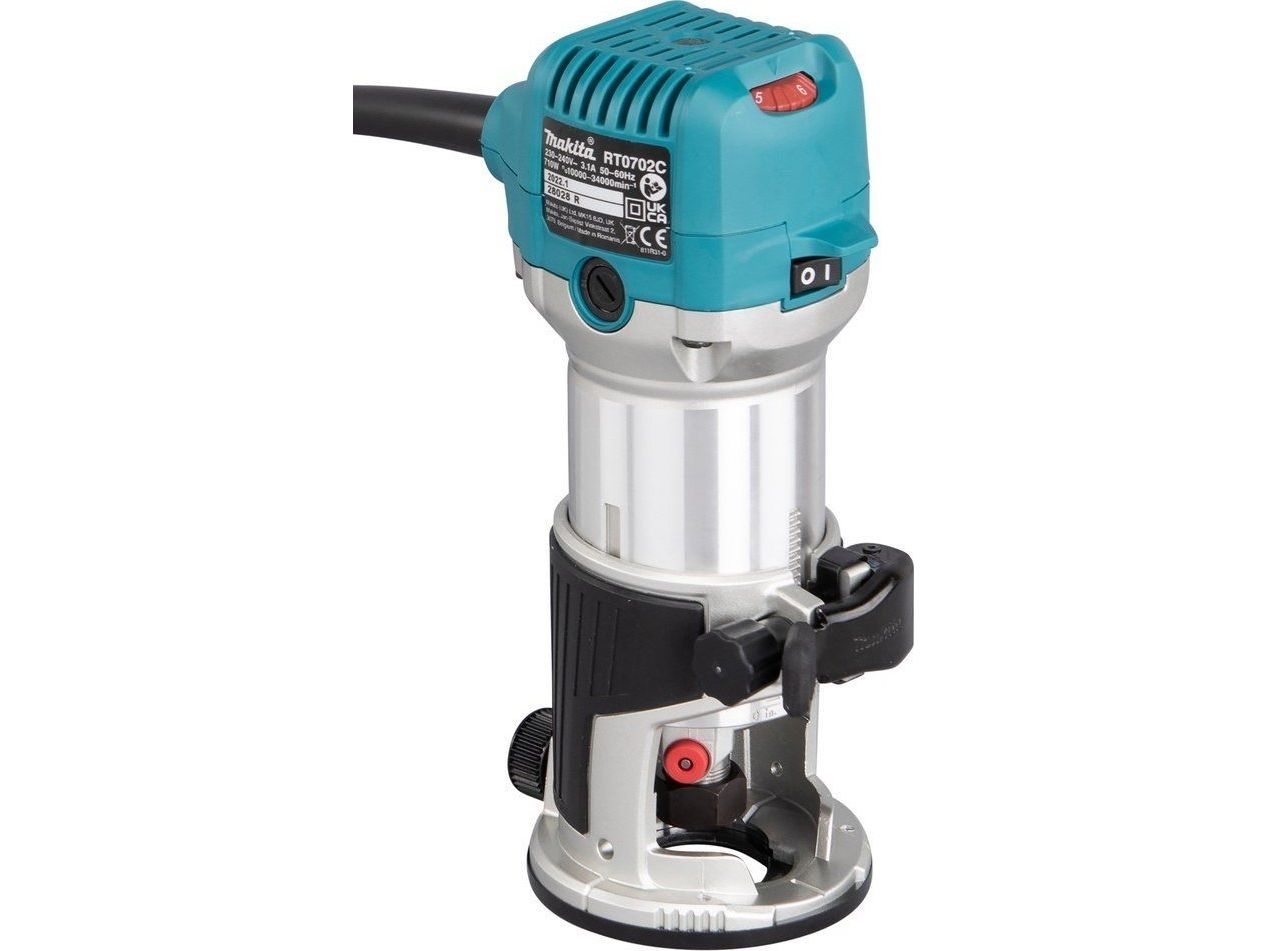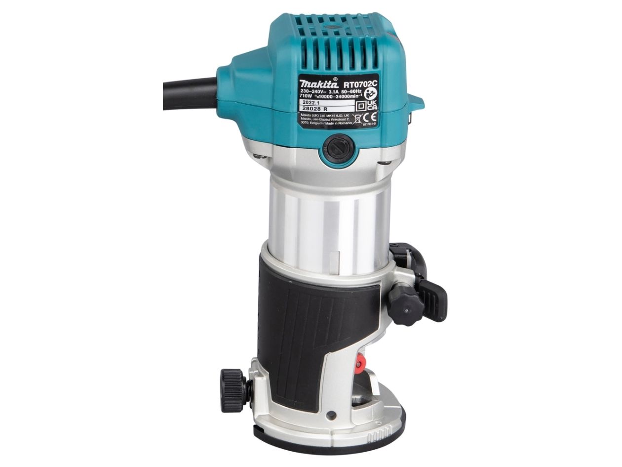 Versatile trimmer with comprehensive range of accessories Handy trimmer for carpentry or hobbies. With this router trimmer, you can cut various grooves or decorative edges in wood. Comes with 6 and 8 mm collets. A wide range of accessories for converting the trimmer to a router, for example.Makita RT0702C. Routers/trimmer base type: Plunge base, Product colour: Green, Grey. Idle speed (max): 34000 RPM, Collet capacity: 6, 8 (5/16"), Idle speed (min): 10000 RPM. Power source: AC, Input power: 710 W, AC input voltage: 230 V. Width: 89 mm, Depth: 89 mm, Height: 210 mm