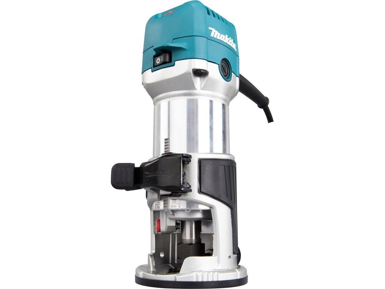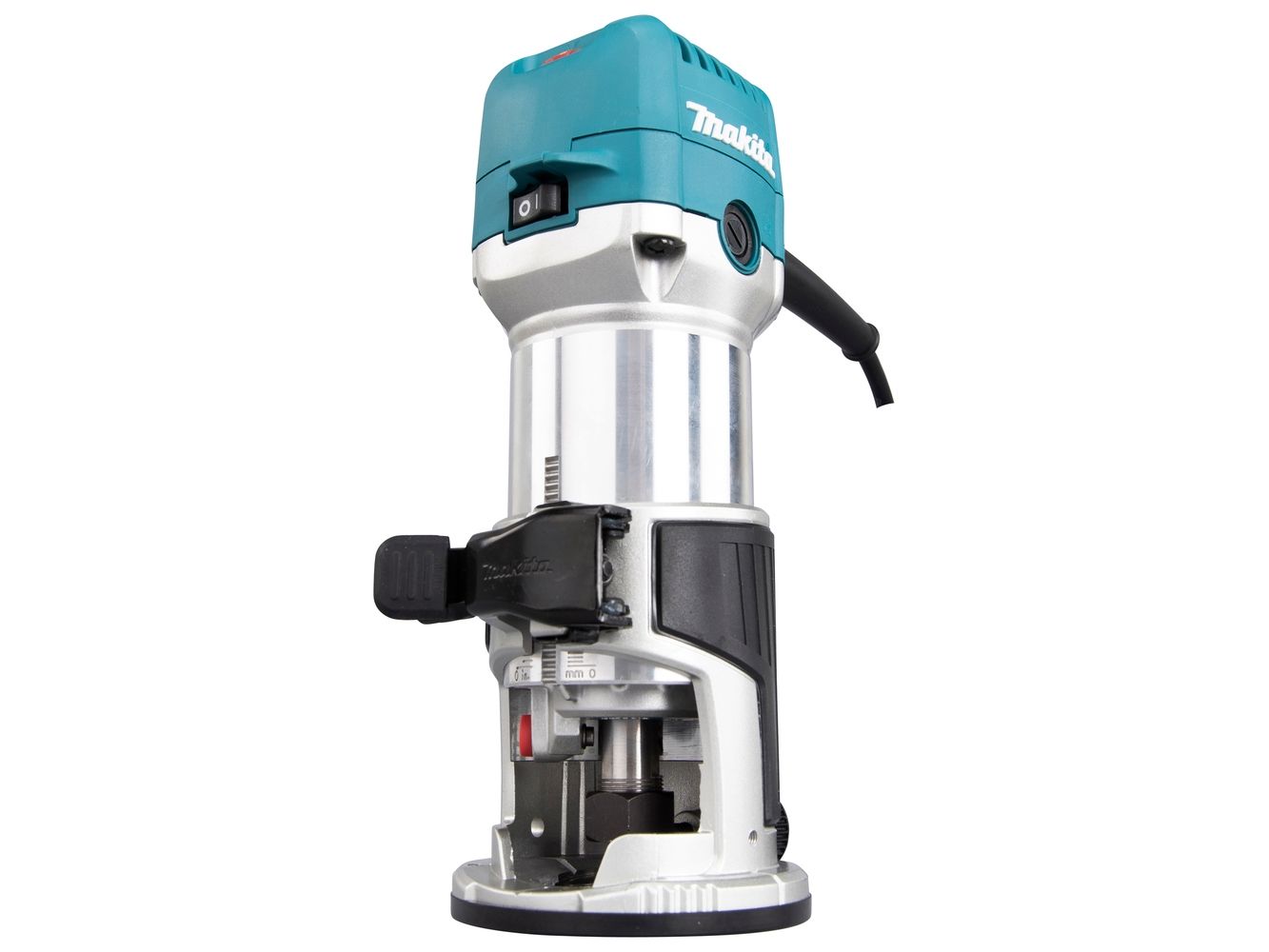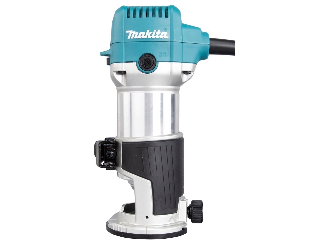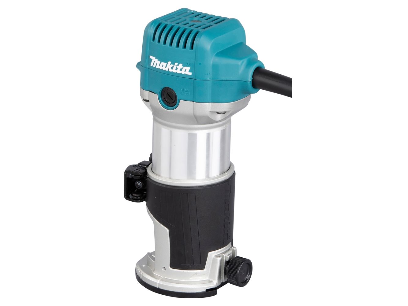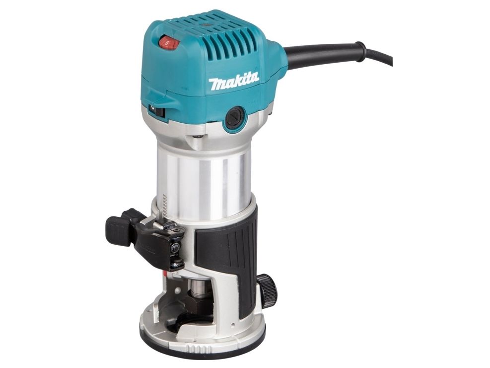 Versatile trimmer with comprehensive range of accessories Handy trimmer for carpentry or hobbies. With this router trimmer, you can cut various grooves or decorative edges in wood. Comes with 6 and 8 mm collets. A wide range of accessories for converting the trimmer to a router, for example.Makita RT0702C. Routers/trimmer base type: Plunge base, Product colour: Green, Grey. Idle speed (max): 34000 RPM, Collet capacity: 6, 8 (5/16"), Idle speed (min): 10000 RPM. Power source: AC, Input power: 710 W, AC input voltage: 230 V. Width: 89 mm, Depth: 89 mm, Height: 210 mm