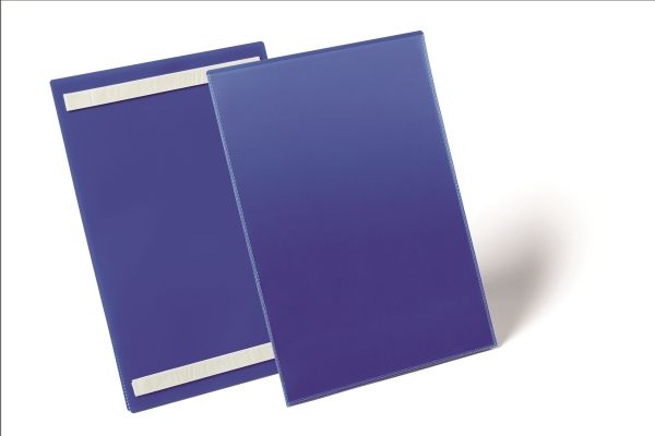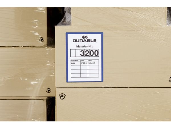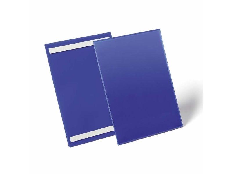 Kennzeichnungstasche mit zwei rückseitigen Permanent-Klebestreifen für die Anwendung auf Kunststoffbehältern, Holz und Kartonagen. Unterstützt die optimierte Kennzeichnung in Produktion und Lager. Blaue Rückenfolie und transparente Vorderfolie aus strapazierfähigem Polypropylen.