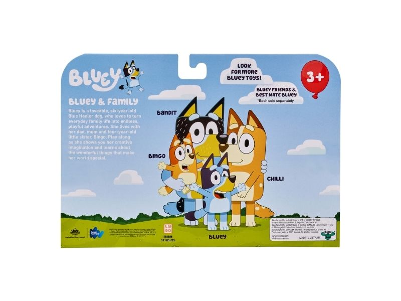Don't you just love Bluey, her family and friends? You can now get the whole Bluey Family (Bluey, Bingo, Dad Bandit, Mom Chili) or Bluey's friends (Bluey, Honey, Coco and snickers) You can play with the characters for hours and make your own stories and games which you think could be fun or you can recreate some of the well-known TV episodes that you love most!