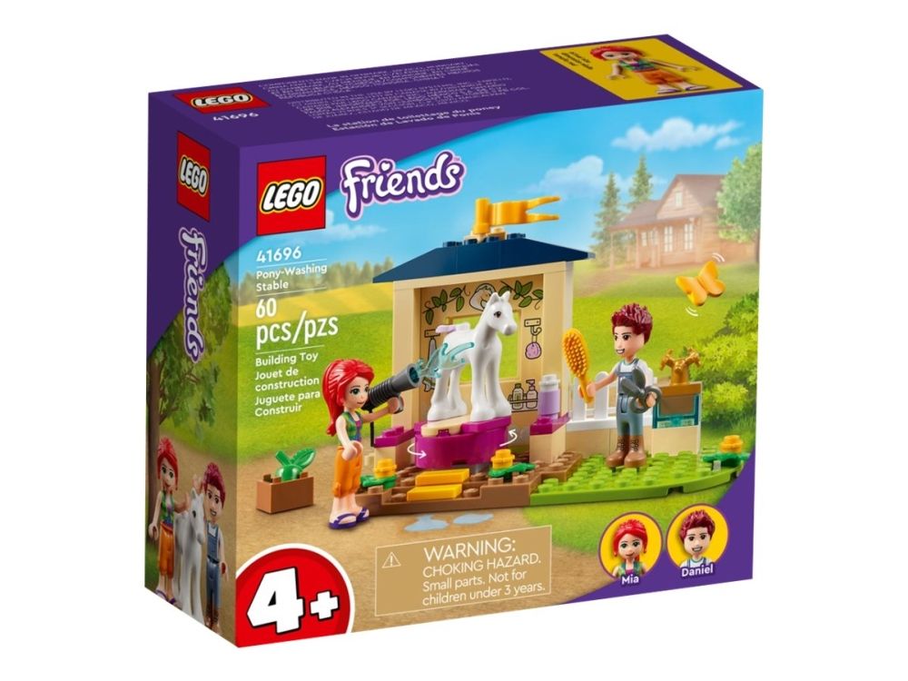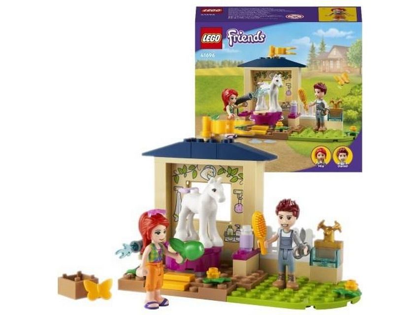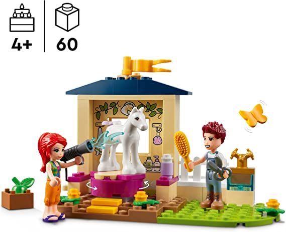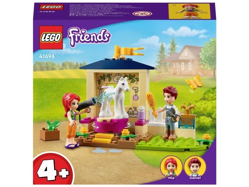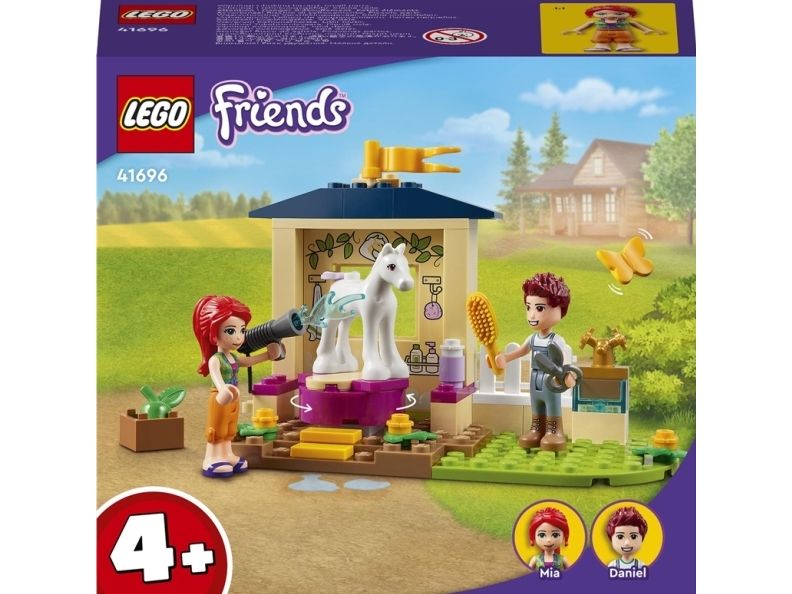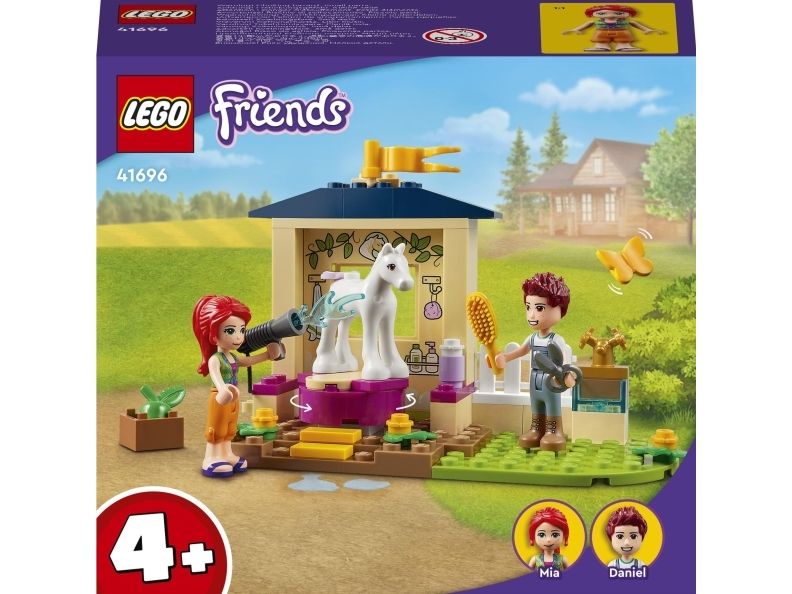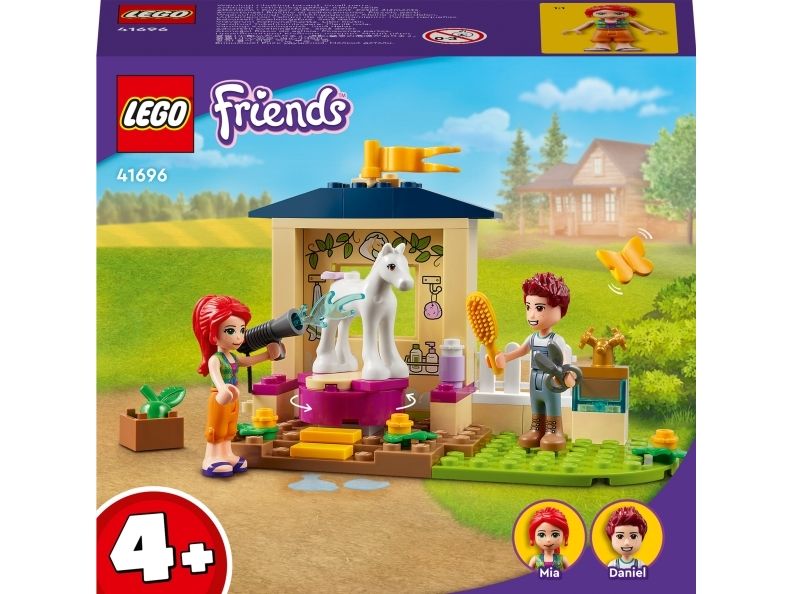 Jede Menge spannende Funktionen: Das Set beinhaltet die LEGO® Friends Spielfiguren Mia und Daniel, ein Spielzeugpony, eine Drehscheibe zum Abduschen des Pferds, einen Schmetterling, einen Apfel, Bürsten und Klammern sowie eine Tränke