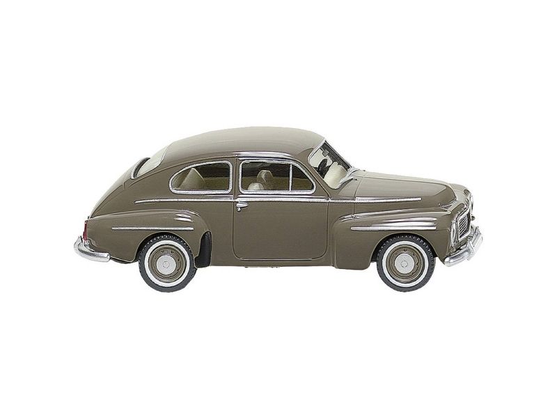 H0 Volvo PV 544Karosserie in mitgeliefertem Grau, Unterboden, Kühlergrill und Lenkrad in Schwarz gehalten. Innenraum hell elfenbein. Scheinwerfer sind transparent, Scheinwerfer auf der Rückleuchte mit transparentem Licht montiert. Felgen in mitgeliefertem Grau, Stoßstangen in Alusilber lackiert. Aufdrucke auf Scheinwerferringen, Kühlergrillrahmen und Volvo-Logo vorne. Zierstreifen seitlich auf der hinteren Stoßstange und auf der Motorhaube. Außerdem erscheinen die Türgriffe in Gilbert. Vorne ist der Rückleuchtenbereich in Gilbert gehalten, dazu der Text "Volvo PV544".