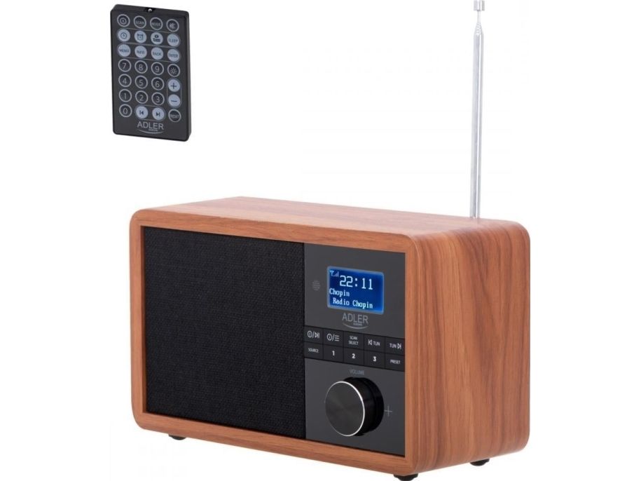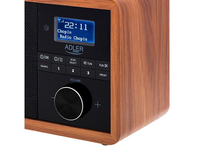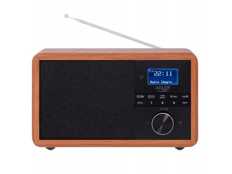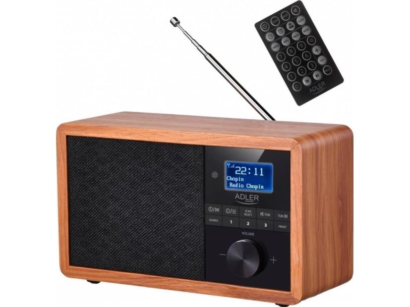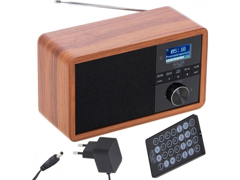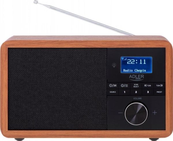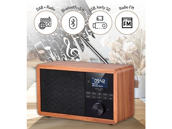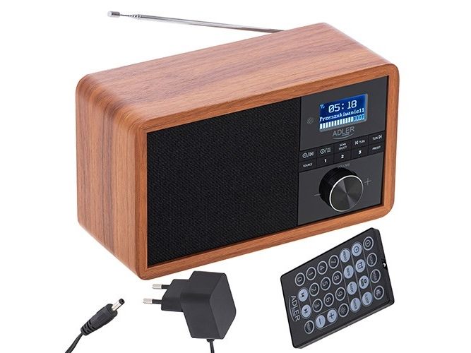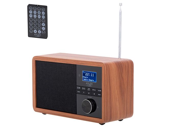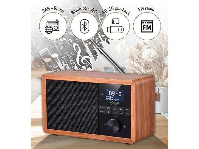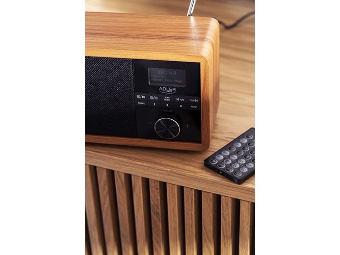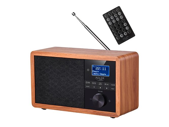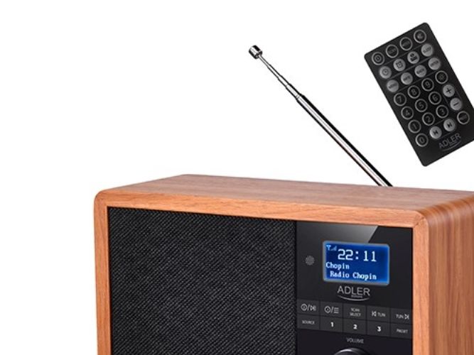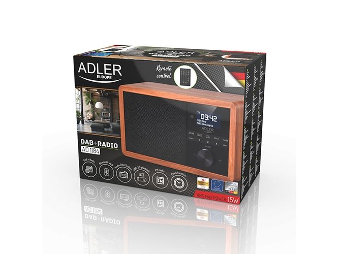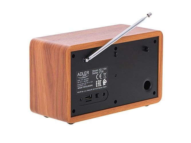 In the era of technology development, we also expect new solutions when it comes to radio receivers. Both at home and at work, we like the time to be pleasant by music or favorite radio programs. The use of Bluetooth technology in Radio AD 1184 allows for its wireless connection with the device from which you play music - a smartphone, tablet or computer. The elegant design and wooden housing allow the radio to fit into any interior. The radio receives broadcasts on FM, AM and DAB + waves. The device is equipped with an easy-to-read LCD display. The radio has a built-in clock and an alarm function. The radio allows you to listen to our favorite programs on FM, AM, and also DAB +. This is a very useful combination of several functions. 3W speakers provide clear and crisp sound. And the station memory allows you to conveniently store your favorite and most-listened stations. The LCD display allows you to conveniently control the operation of the device and is an interesting accent in the wooden housing.Adler AD 1184. Radio type: Portable, Tuner type: Digital, Supported radio bands: AM, DAB+, FM. RMS rated power: 15 W. Headphone connectivity: 3.5 mm. Product colour: Black, Wood, Antenna type: Internal. Compatible memory cards: SD