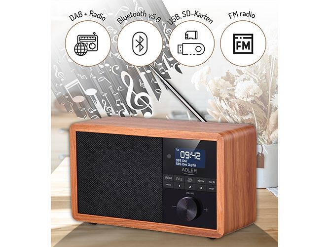 Adler AD 1184, Tragbar, Digital, AM, DAB+, FM, 15 W, 3,5 mm, Schwarz, Holz