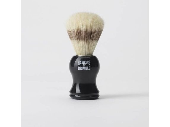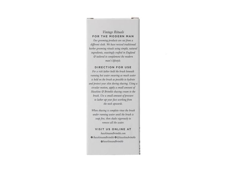For a rich lather hold the brush beneath running hot water ensuring as much water is held on the brush as possible to hydrate and protect your skin during shaving. Using a circular motion, apply a small amount of Hawkins & Brimble shaving cream to the brush. Use a small amount of pressure to lather up your face working from the neck upwards.