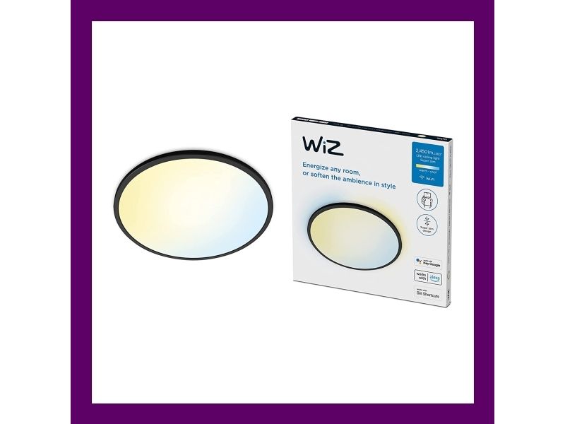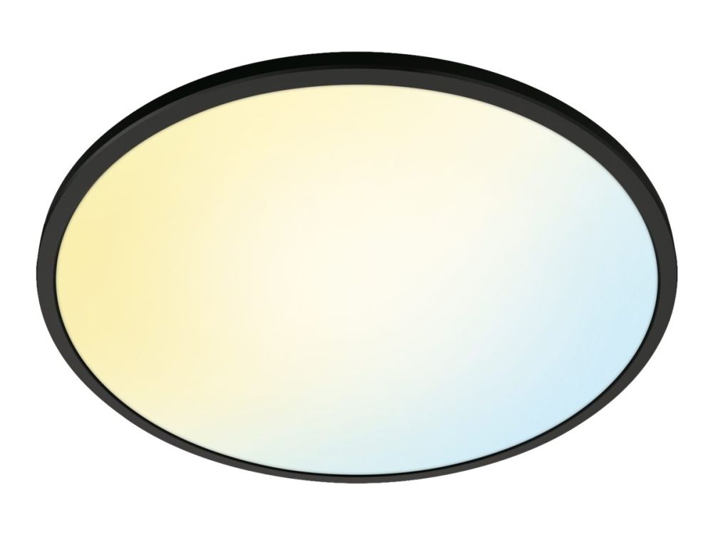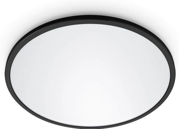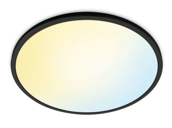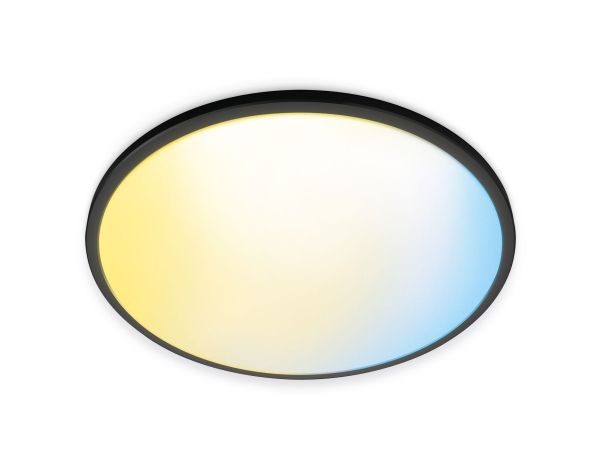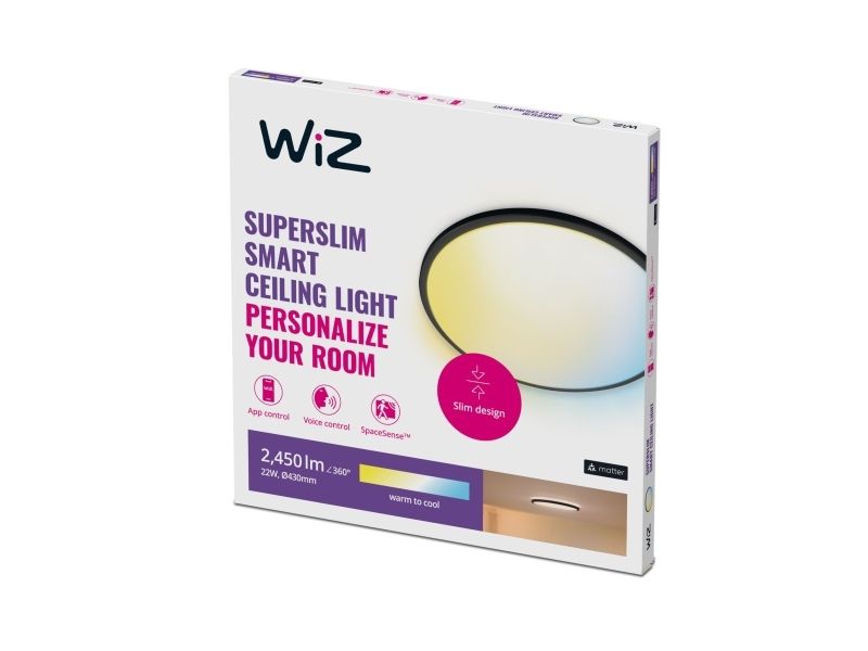 Smart light that's got style A slim circle that changes from cool blue to warm yellowish light. With built-in light recipe and dimming. Light that suits your day-to-day life is easy with WiZ Super Slim. Its large, circular light surface floods your room with cool blue light to promote alertness and concentration and dims into a soft and warm colour to help you relax.WiZ Superslim Ceiling 22 W. Type: Smart ceiling light, Interface: Wi-Fi/Bluetooth, Product colour: Black. Input voltage: 220-240 V, AC input frequency: 50 - 60 Hz, AC input voltage: 220-240 V. Width: 430 mm, Depth: 430 mm, Height: 23 mm. Package width: 425 mm, Package depth: 28 mm, Package height: 430 mm. Quantity per pack: 1 pc(s)