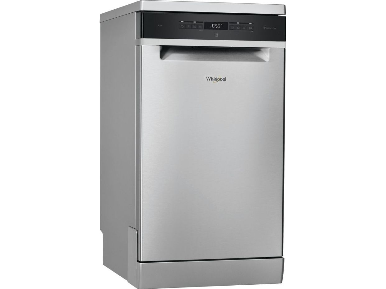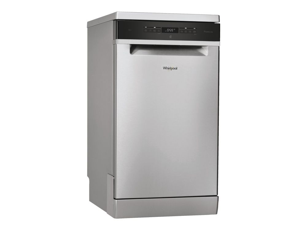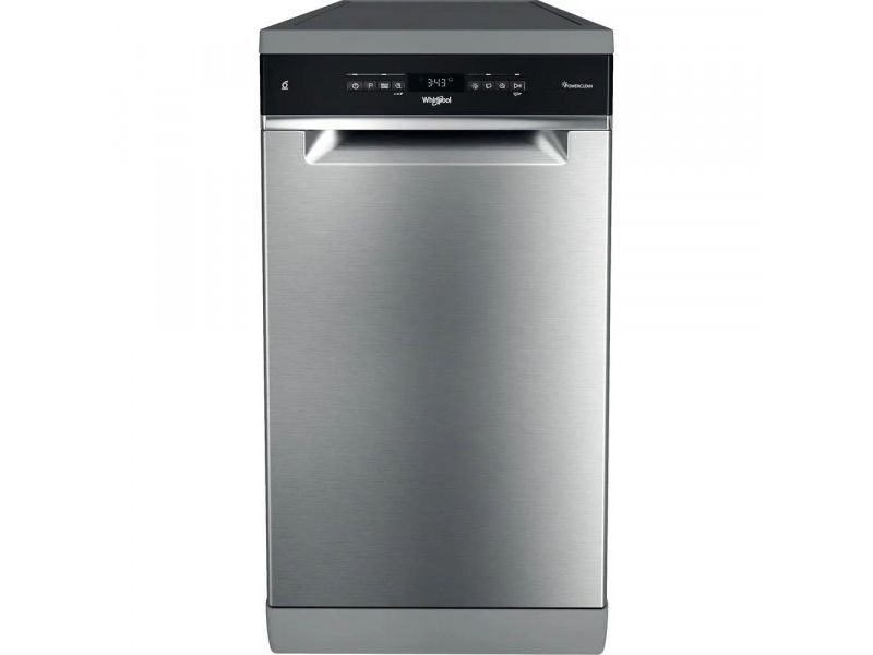 Whirlpool WSFO 3T223 PC X. Appliance placement: Freestanding, Product size: Slimline (45 cm), Door colour: Stainless steel. Number of place settings: 10 place settings, Noise emission class: B, Noise level: 43 dB. Energy efficiency class: E, Water consumption per cycle: 9 L, Energy consumption per 100 cycles: 76 kWh. Width: 450 mm, Depth: 590 mm, Height: 850 mm. Package width: 500 mm, Package depth: 675 mm, Package height: 890 mm