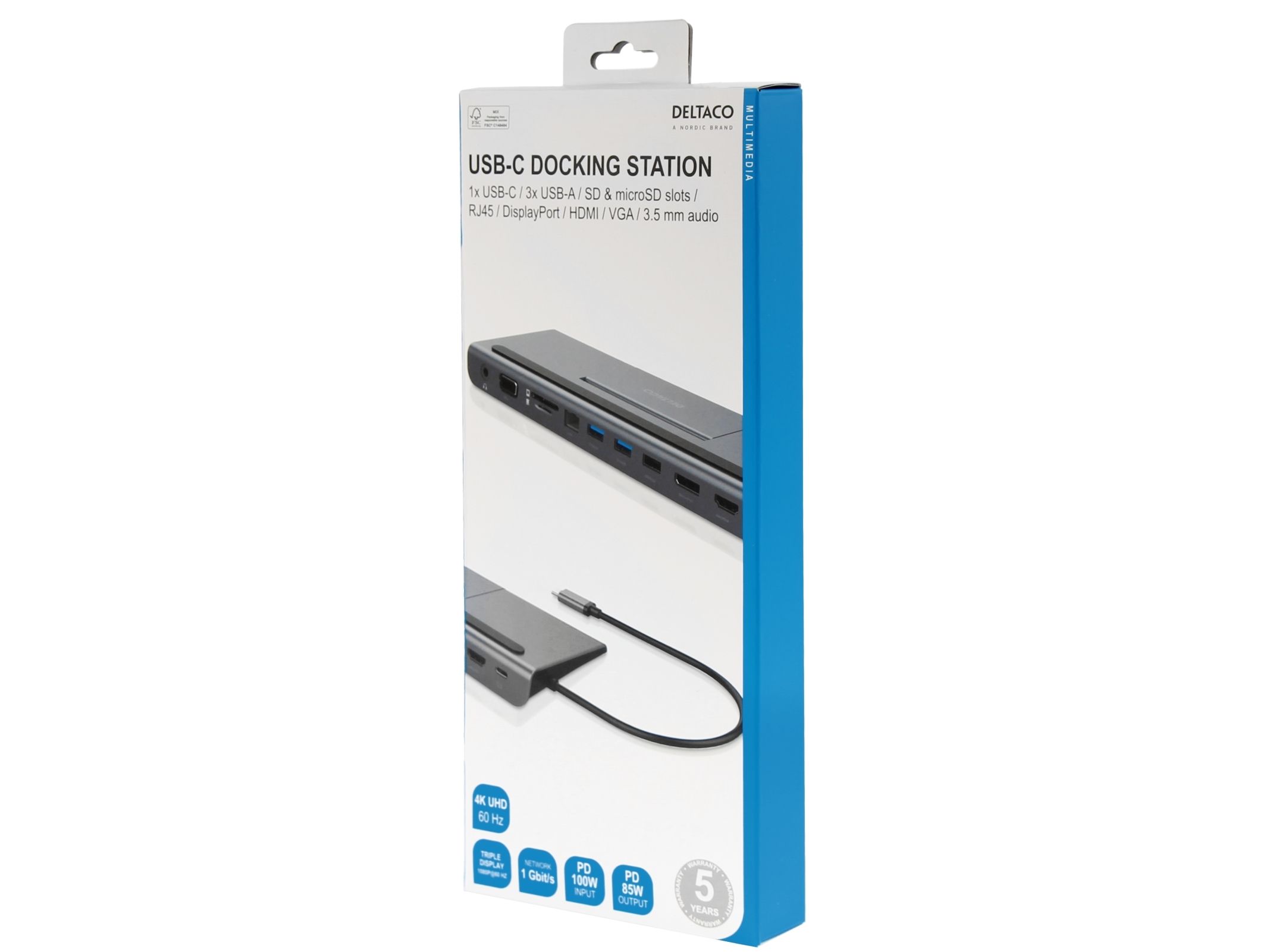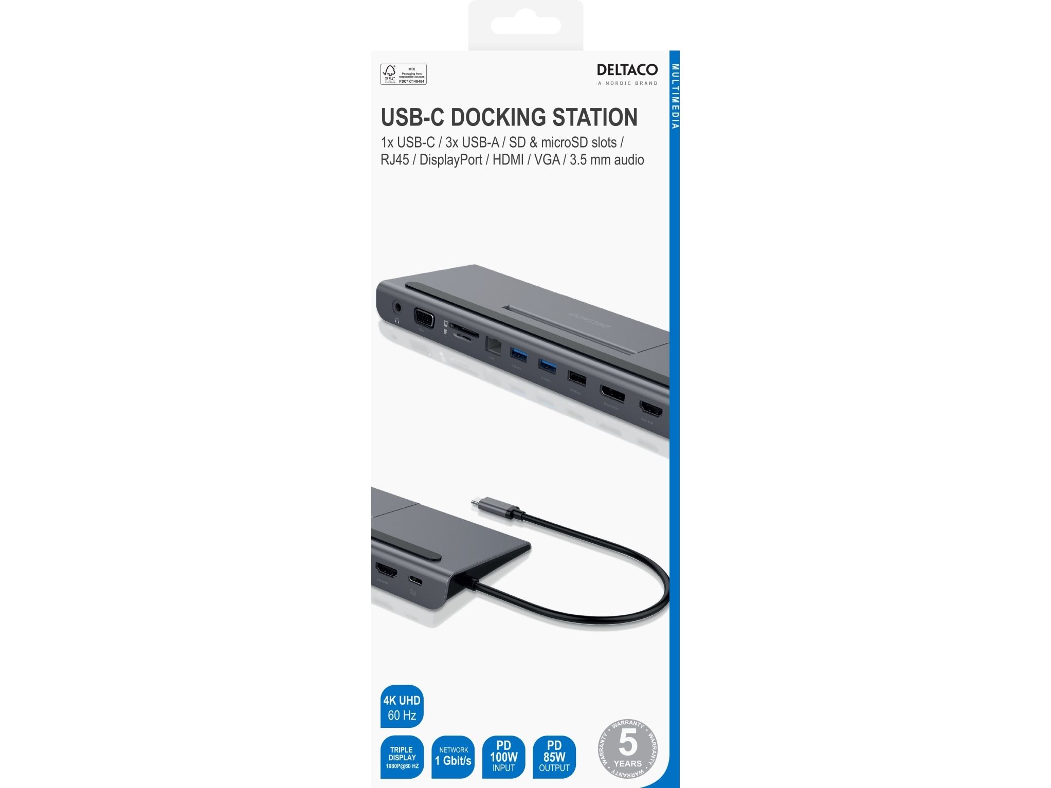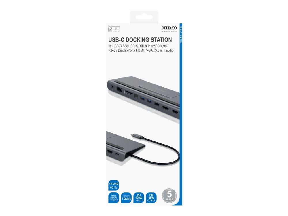 Fast charge your mobile devices, with 85 W USB-C Power Delivery you can quickly and efficiently charge your laptop, tablet, smartphone and other USB-C devices.Deltaco USBC-DOCK2. Connectivity technology: Wired, Host interface: USB 3.2 Gen 1 (3.1 Gen 1) Type-C, USB Power Delivery up to: 85 W. Ethernet LAN data rates: 1000 Mbit/s. Product colour: Grey, Colour name: Space gray, Compatible memory cards: SD. Windows operating systems supported: Windows 10, Windows 11, Windows 7, Windows 8, Mac operating systems supported: MacOS. Quantity per pack: 1 pc(s)