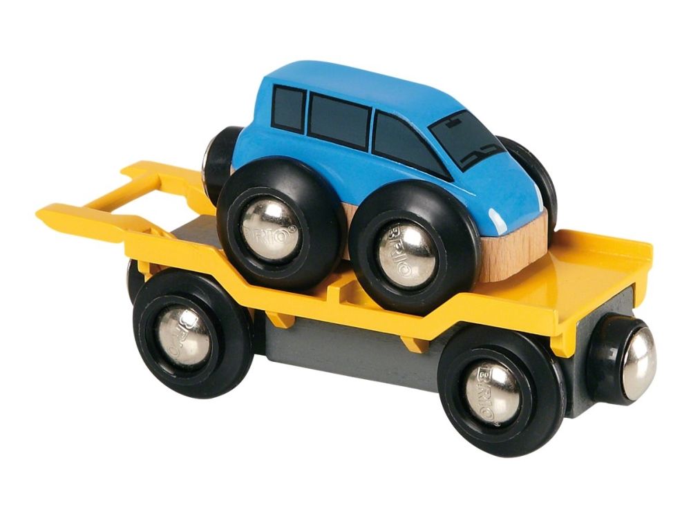 Add this car transporter to your Railway world complete with a BRIO car. Let the car drive on and off the transporter by tilting the wagon ramp. Attach two or more transporter wagons for added fun - the cars can then drive from one wagon to another.