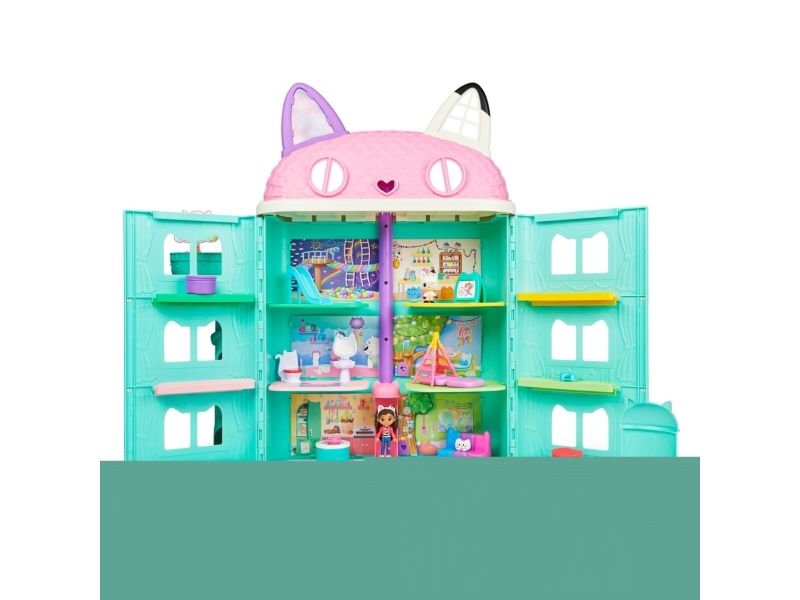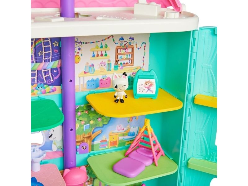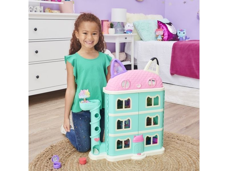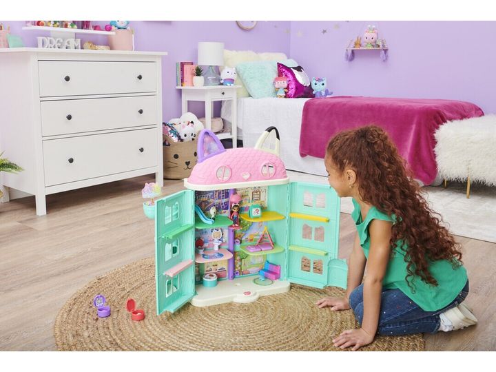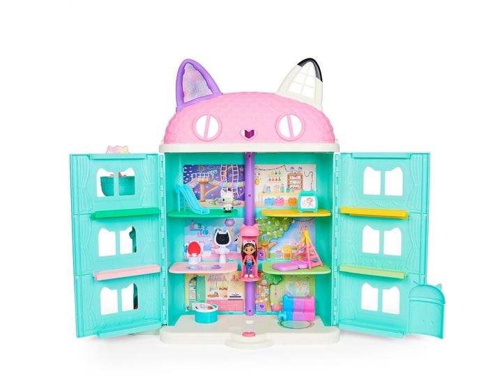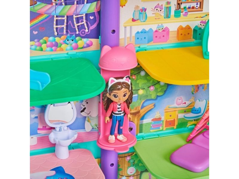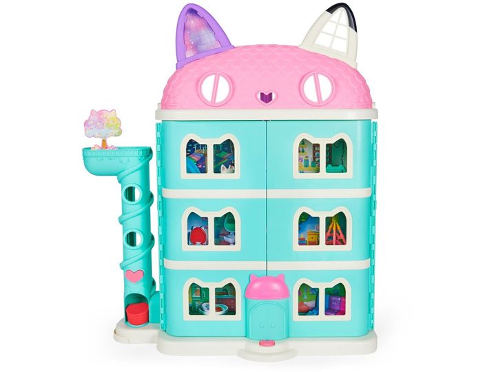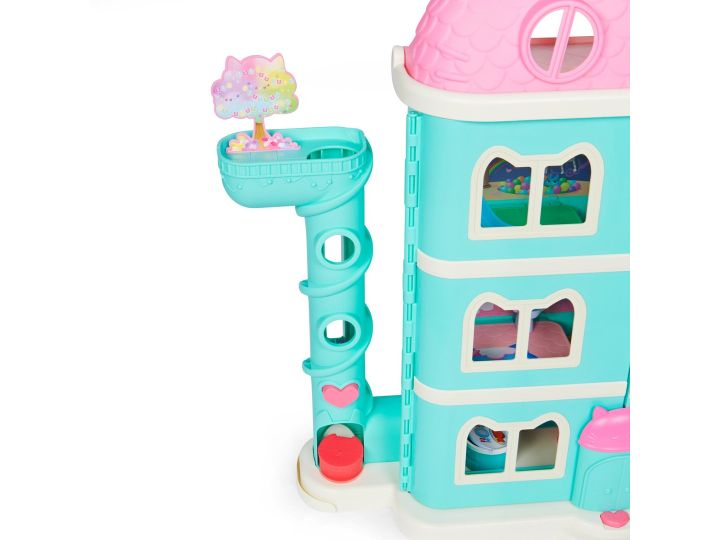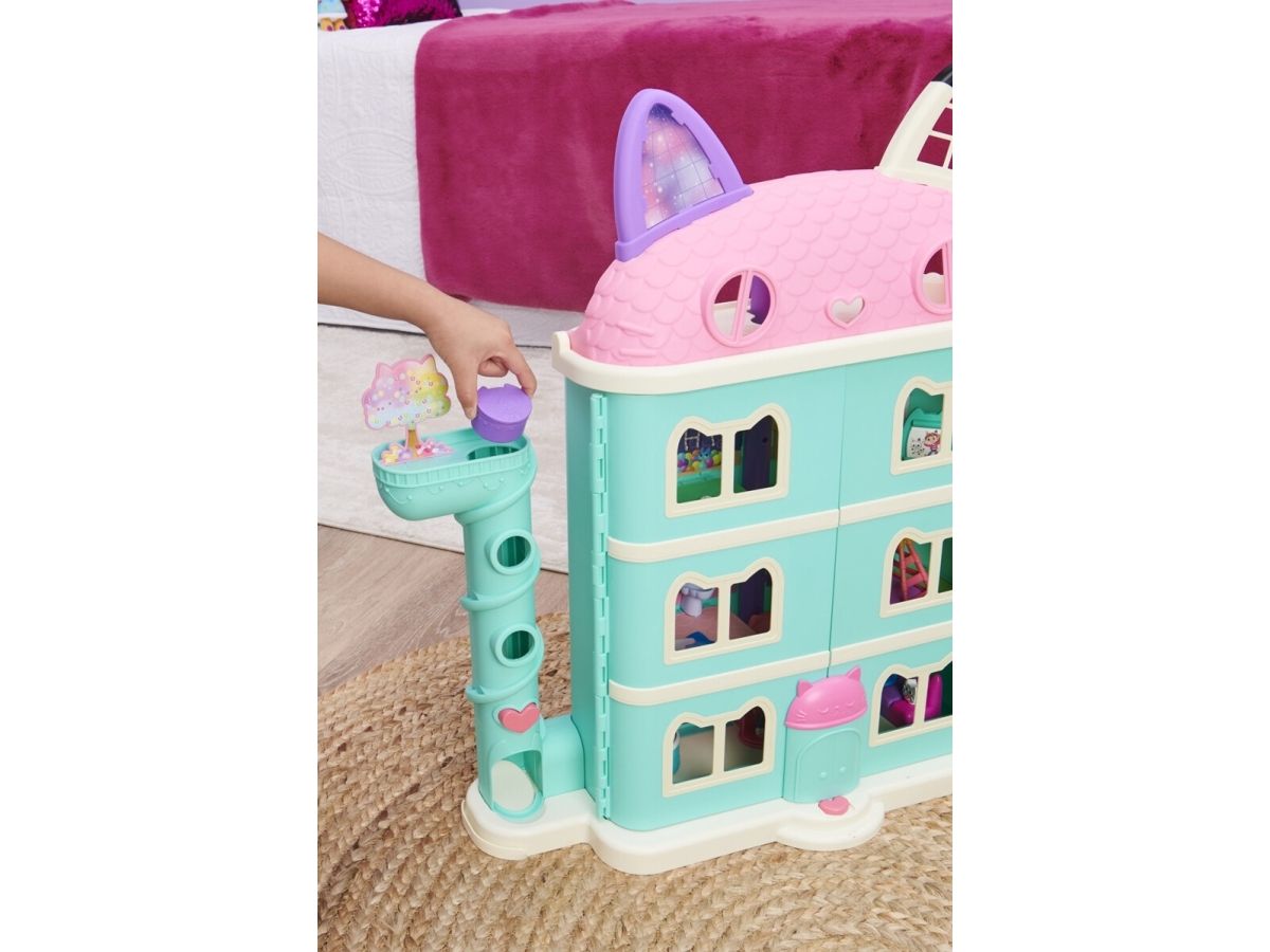 Leg i din egen dukkehusverden med Gabbys Dukkehus Kat-tastisk Dukkehus. Med en højde på over 60 cm er dette fantastiske dukkehus fyldt med spændende funktioner, som du kan gå på opdagelse i, inklusiv et dukkehusleveringstårn, fungerende elevator, lyde og meget mere. Huset indeholder en 9 cm Gabby-figur, Pandy Pote-figur, møbler til alle værelser, tre tilbehørsdele og to dukkehusleveringer, så du kan hoppe direkte fra kassen og ind i legen. Ligesom i serien kan du smide en levering i tårnet og trykke på knappen for at hente den - pak den ud for at finde et overraskelsestilbehør indeni. Åbn dukkehuset og tryk på knappen på forsiden for at høre dine yndlingssange, lyde og sætninger fra serien. Med så mange rum og overraskelser kan du bruge din fantasi og gå på endeløse eventyr med Gabby og hendes bedste ven, Pandy Pote. Slap af i musikrummets farverige sofa, og åbn døren på træet for at afsløre en gæst. Sulten? Vend bordet i køkkenet for at forvandle det fra morgenmad til aftensmad.