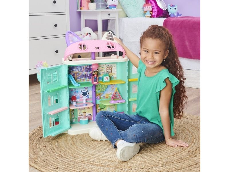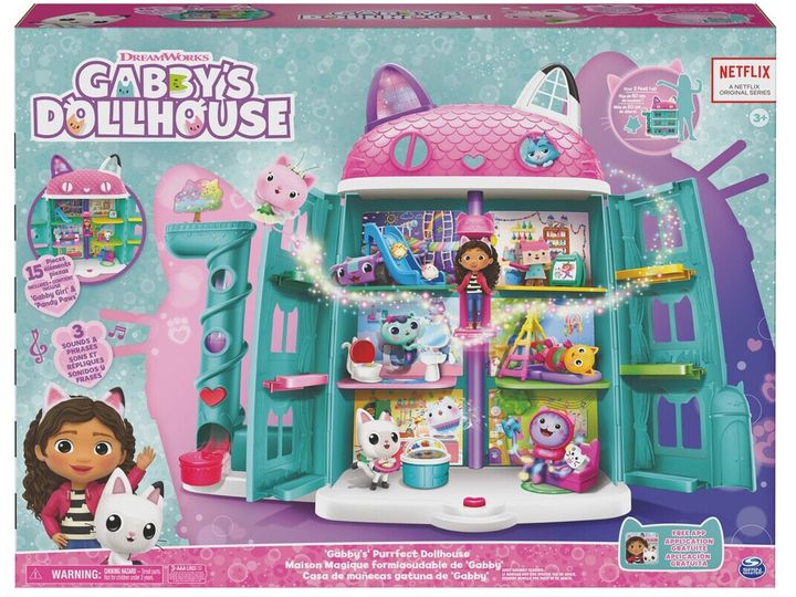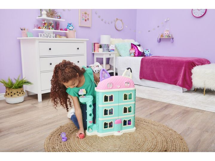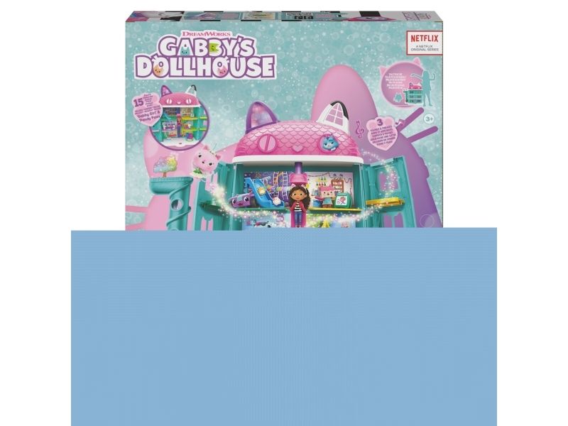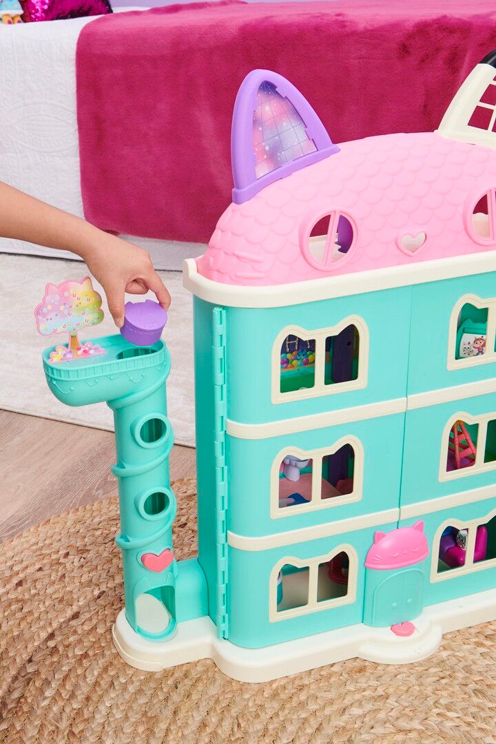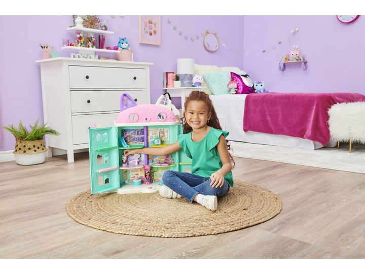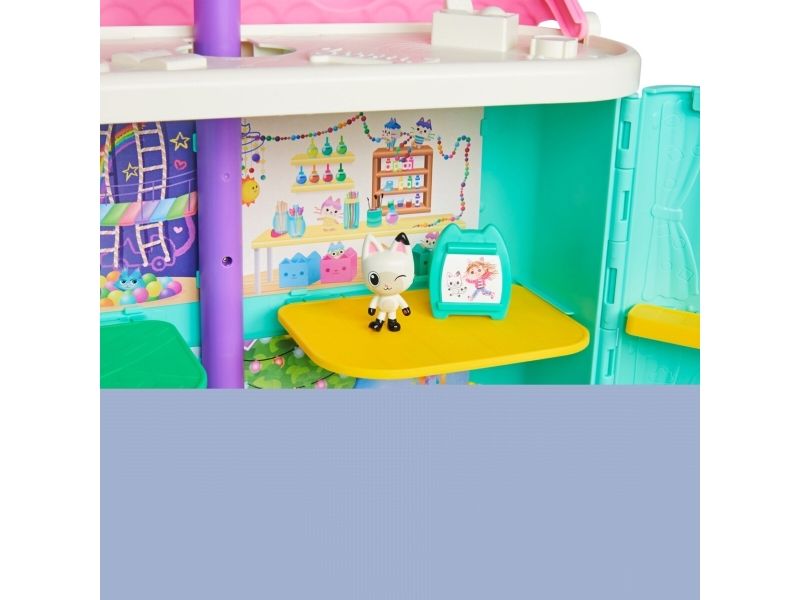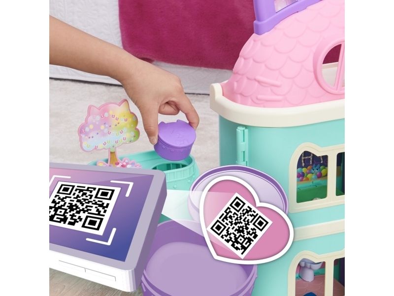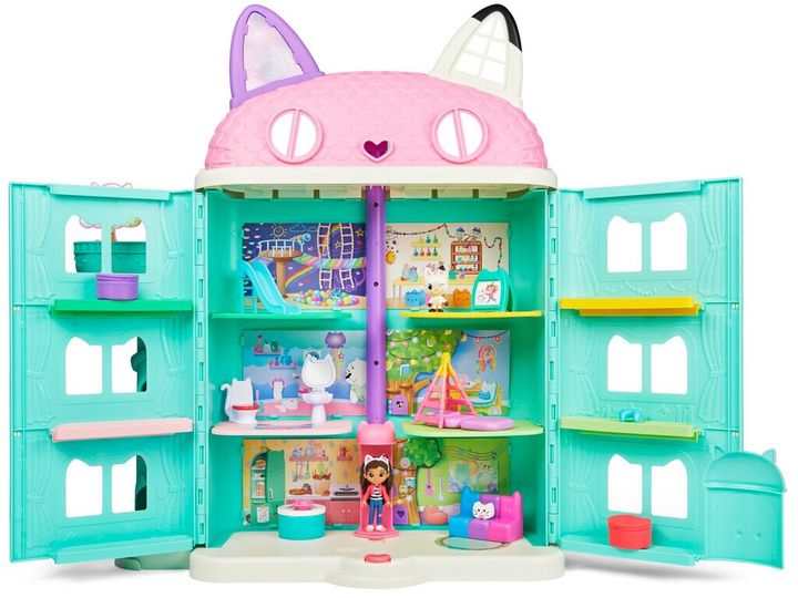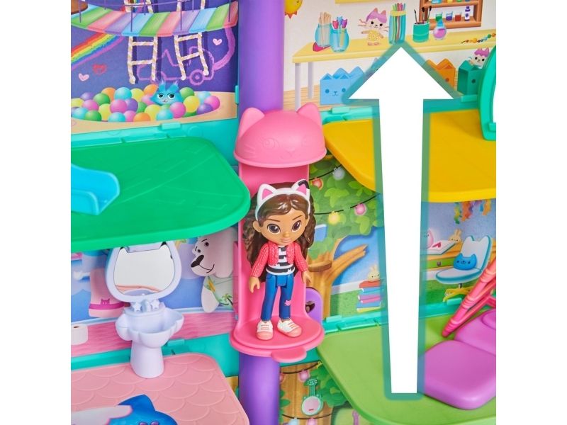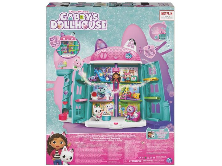 Leg i din egen dukkehusverden med Gabbys Dukkehus Kat-tastisk Dukkehus. Med en højde på over 60 cm er dette fantastiske dukkehus fyldt med spændende funktioner, som du kan gå på opdagelse i, inklusiv et dukkehusleveringstårn, fungerende elevator, lyde og meget mere. Huset indeholder en 9 cm Gabby-figur, Pandy Pote-figur, møbler til alle værelser, tre tilbehørsdele og to dukkehusleveringer, så du kan hoppe direkte fra kassen og ind i legen. Ligesom i serien kan du smide en levering i tårnet og trykke på knappen for at hente den - pak den ud for at finde et overraskelsestilbehør indeni. Åbn dukkehuset og tryk på knappen på forsiden for at høre dine yndlingssange, lyde og sætninger fra serien. Med så mange rum og overraskelser kan du bruge din fantasi og gå på endeløse eventyr med Gabby og hendes bedste ven, Pandy Pote. Slap af i musikrummets farverige sofa, og åbn døren på træet for at afsløre en gæst. Sulten? Vend bordet i køkkenet for at forvandle det fra morgenmad til aftensmad.