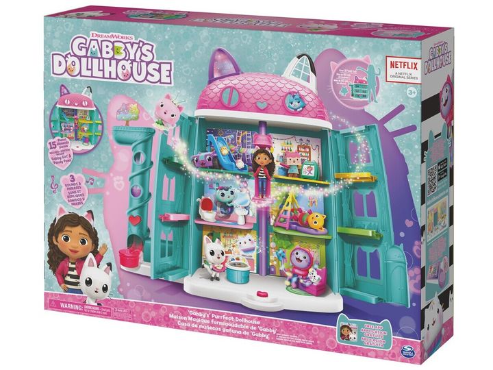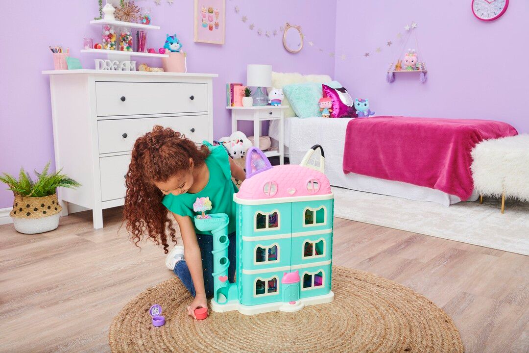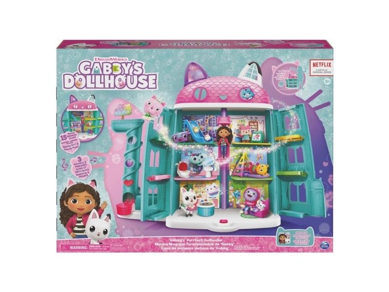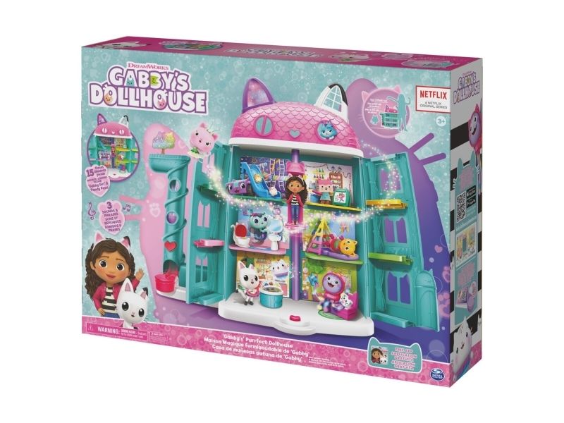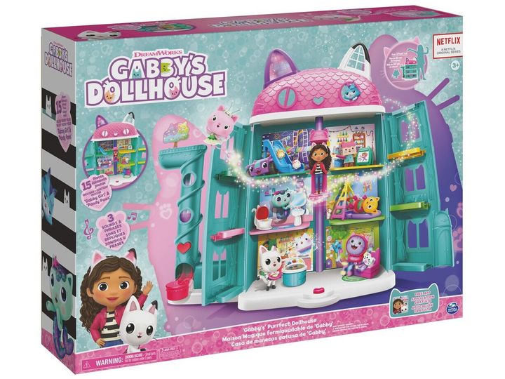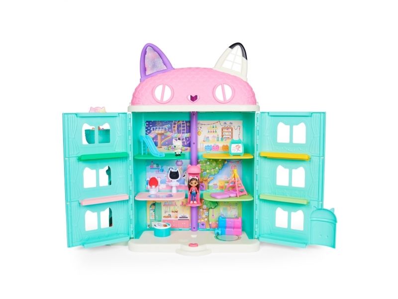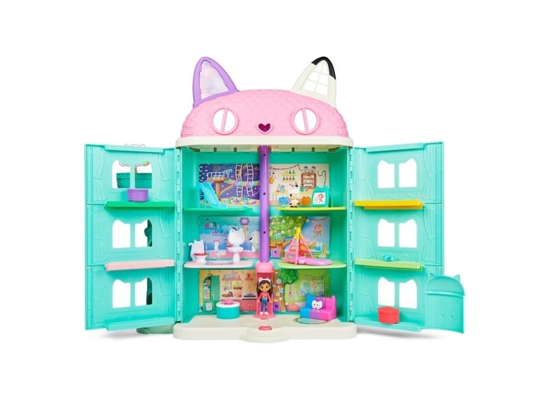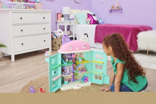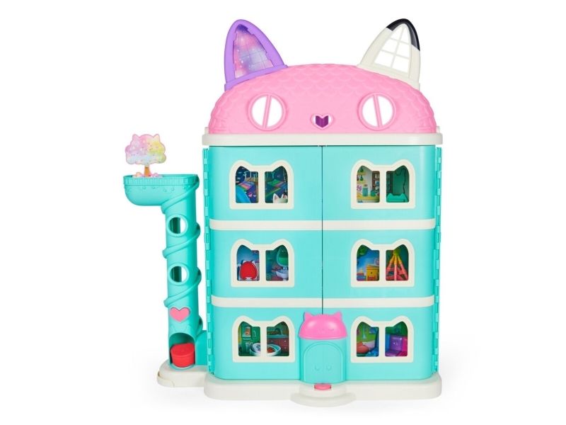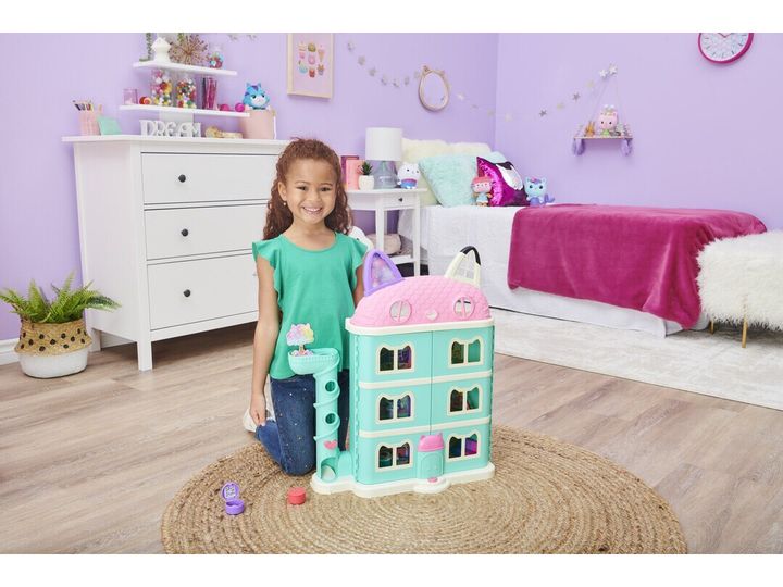 Leg i din egen dukkehusverden med Gabbys Dukkehus Kat-tastisk Dukkehus. Med en højde på over 60 cm er dette fantastiske dukkehus fyldt med spændende funktioner, som du kan gå på opdagelse i, inklusiv et dukkehusleveringstårn, fungerende elevator, lyde og meget mere. Huset indeholder en 9 cm Gabby-figur, Pandy Pote-figur, møbler til alle værelser, tre tilbehørsdele og to dukkehusleveringer, så du kan hoppe direkte fra kassen og ind i legen. Ligesom i serien kan du smide en levering i tårnet og trykke på knappen for at hente den - pak den ud for at finde et overraskelsestilbehør indeni. Åbn dukkehuset og tryk på knappen på forsiden for at høre dine yndlingssange, lyde og sætninger fra serien. Med så mange rum og overraskelser kan du bruge din fantasi og gå på endeløse eventyr med Gabby og hendes bedste ven, Pandy Pote. Slap af i musikrummets farverige sofa, og åbn døren på træet for at afsløre en gæst. Sulten? Vend bordet i køkkenet for at forvandle det fra morgenmad til aftensmad.