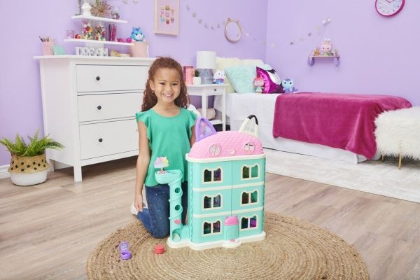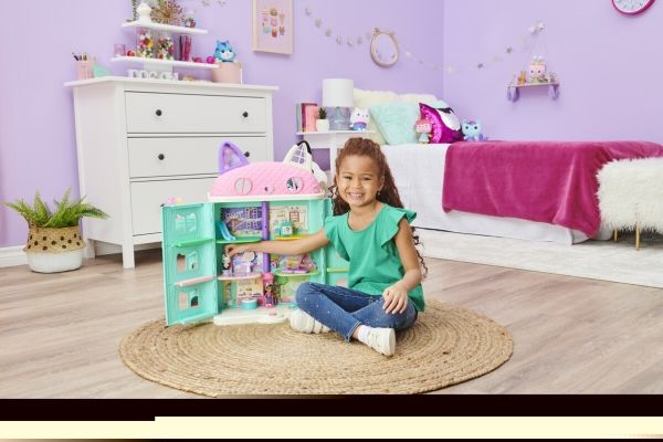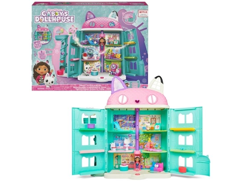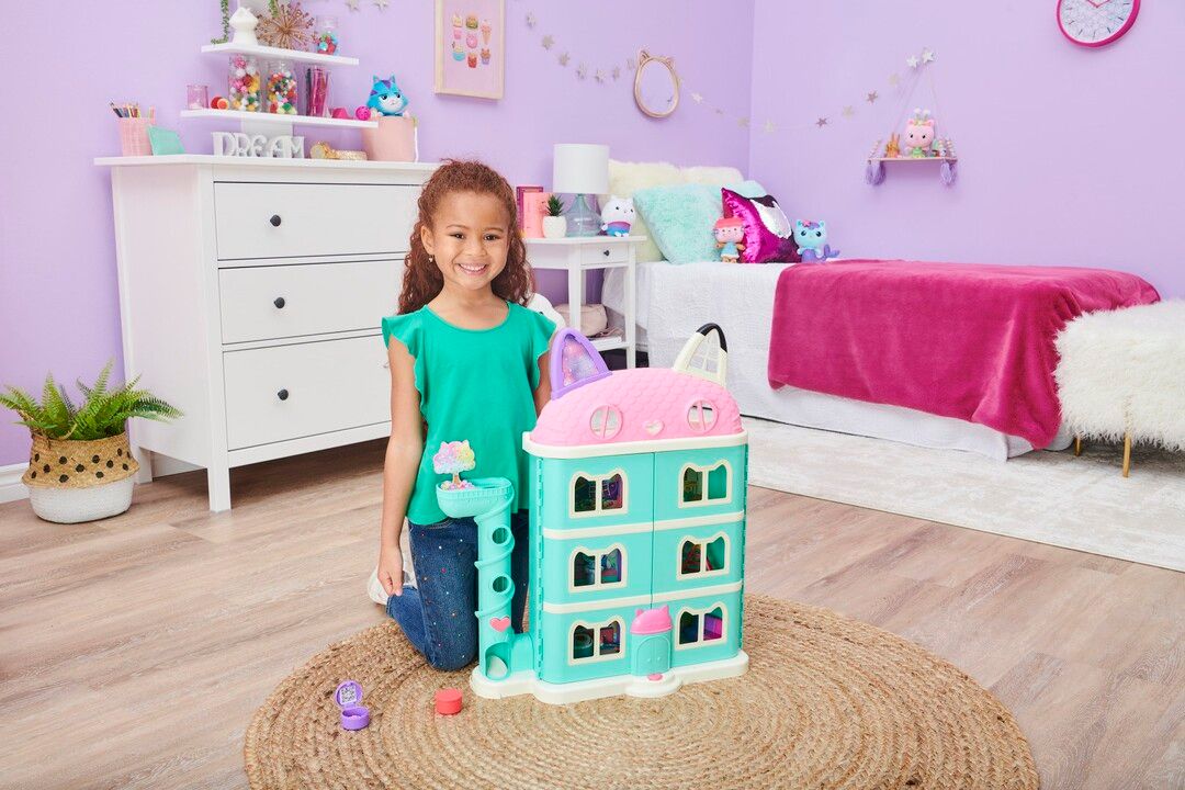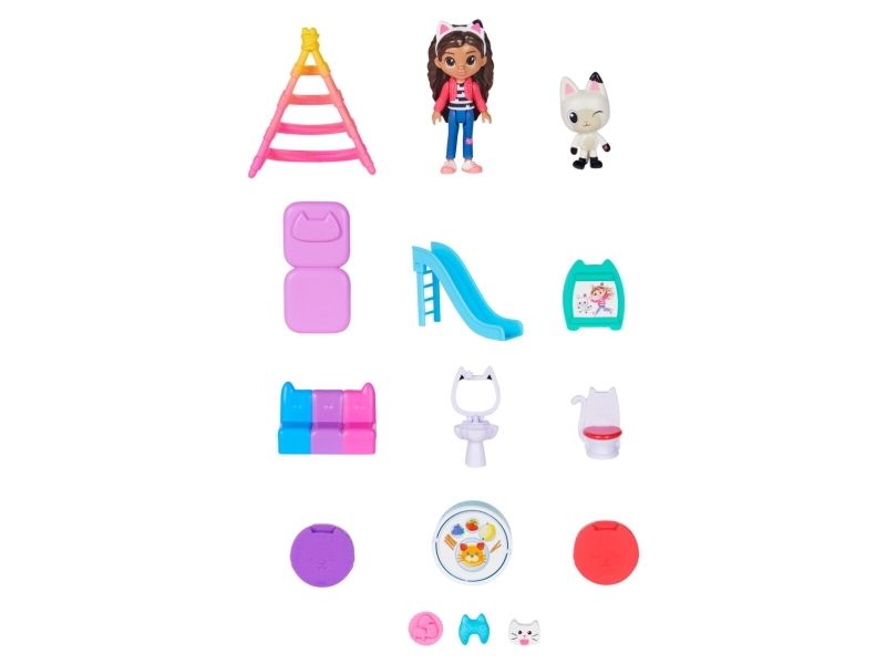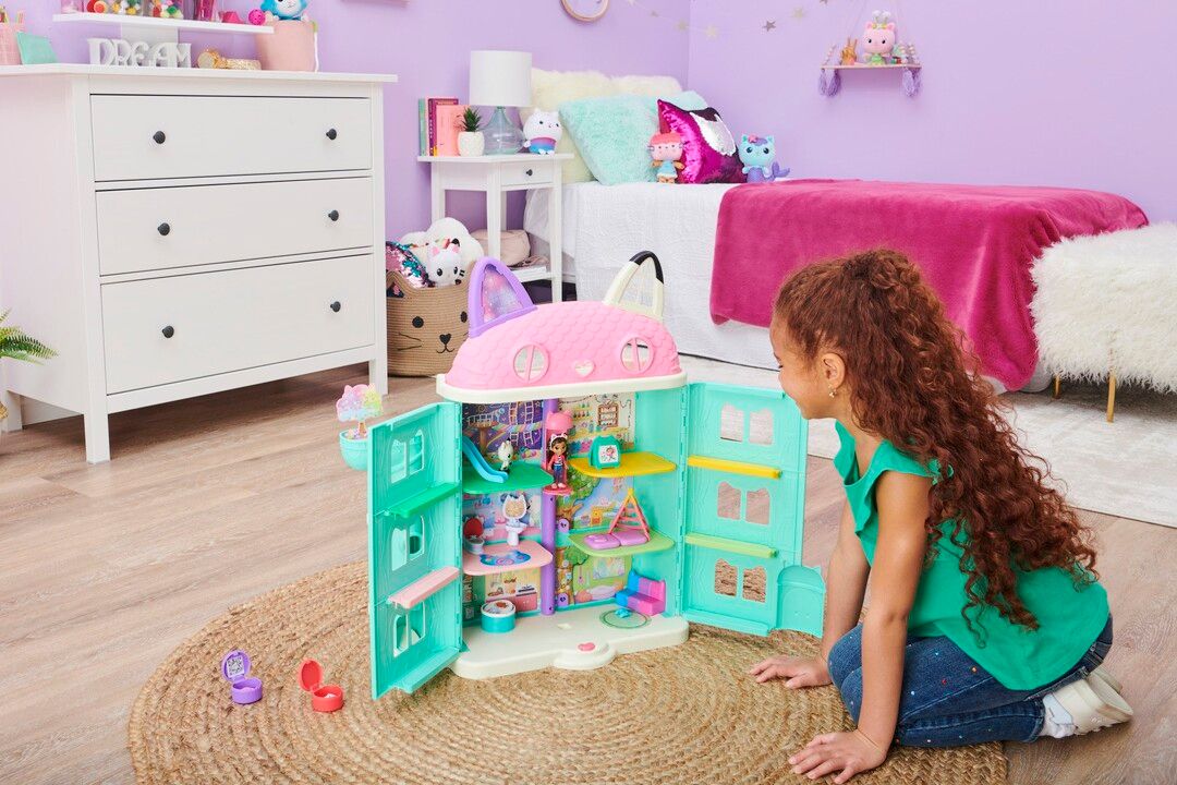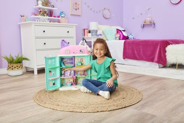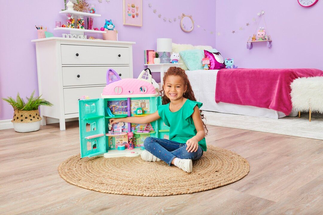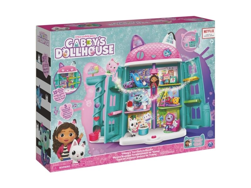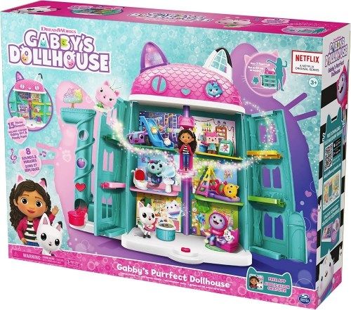 Leg i din egen dukkehusverden med Gabbys Dukkehus Kat-tastisk Dukkehus. Med en højde på over 60 cm er dette fantastiske dukkehus fyldt med spændende funktioner, som du kan gå på opdagelse i, inklusiv et dukkehusleveringstårn, fungerende elevator, lyde og meget mere. Huset indeholder en 9 cm Gabby-figur, Pandy Pote-figur, møbler til alle værelser, tre tilbehørsdele og to dukkehusleveringer, så du kan hoppe direkte fra kassen og ind i legen. Ligesom i serien kan du smide en levering i tårnet og trykke på knappen for at hente den - pak den ud for at finde et overraskelsestilbehør indeni. Åbn dukkehuset og tryk på knappen på forsiden for at høre dine yndlingssange, lyde og sætninger fra serien. Med så mange rum og overraskelser kan du bruge din fantasi og gå på endeløse eventyr med Gabby og hendes bedste ven, Pandy Pote. Slap af i musikrummets farverige sofa, og åbn døren på træet for at afsløre en gæst. Sulten? Vend bordet i køkkenet for at forvandle det fra morgenmad til aftensmad.