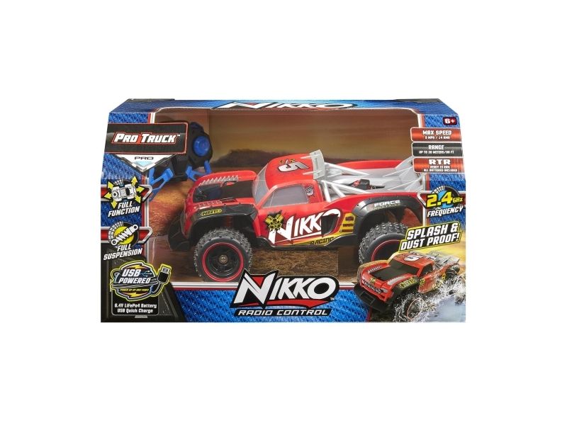 Mit dem Nikko Pro Truck mit spritzwasser- und schlammtauglichem Fahrgestell geht es auf die Piste. Schlamm, Sand, Dreck und nicht einmal Schnee sind für diesen schnellen Flitzer kein Problem. Mit dem geschlossenen, wasserdichten Fahrgestell, der voll funktionsfähigen Federung, der großen Motorleistung und dem schnell aufladbaren USB-Akku bahnst du dir im Handumdrehen deinen Weg durch jedes Gelände! Höchstgeschwindigkeit 14 km/h. Spielbereit mit 6,4 LIFEPO4 USB-Schnellladebatterien, die im Fahrzeug enthalten sind. Der Sender wird mit 3 x AAA-Batterien betrieben (im Lieferumfang enthalten). Ab 6 Jahren.