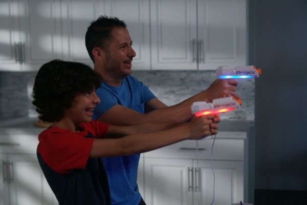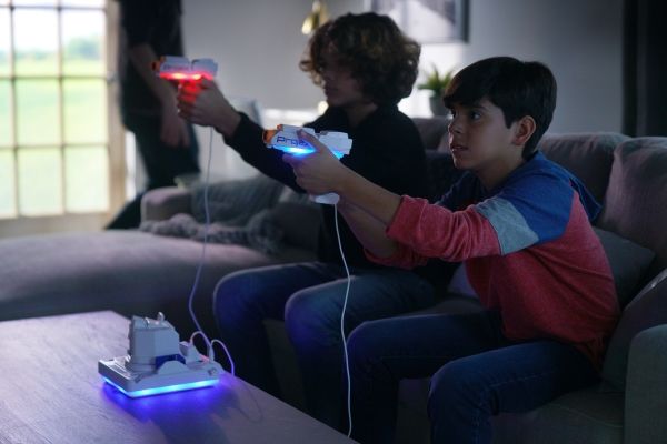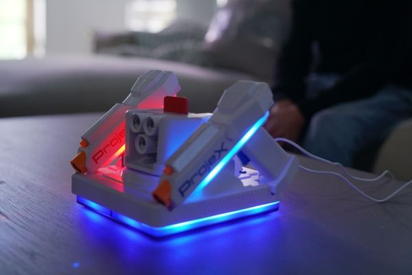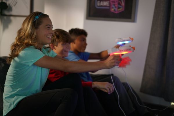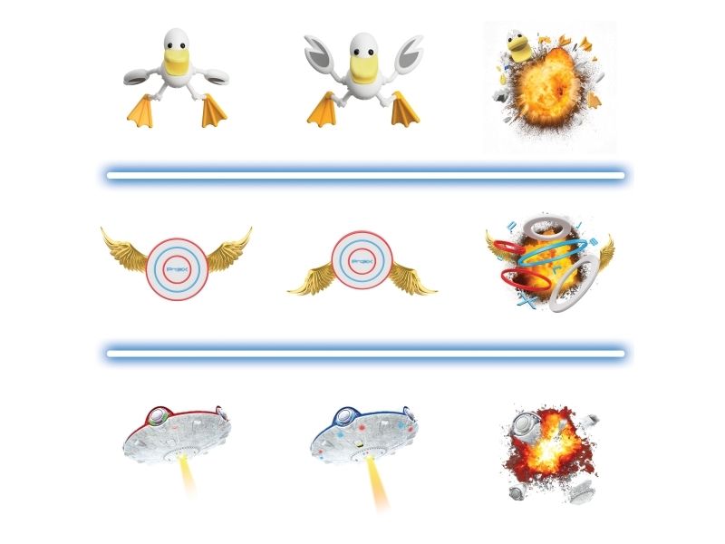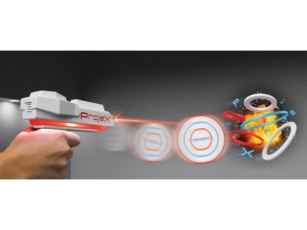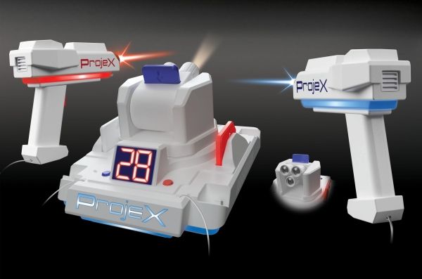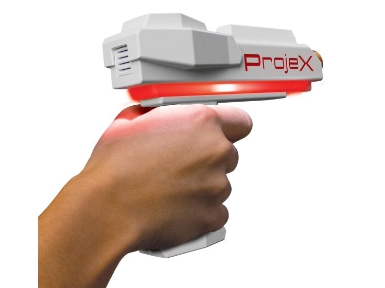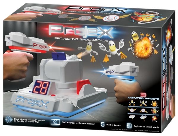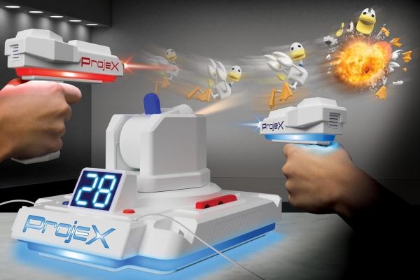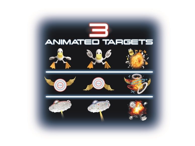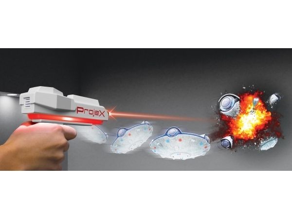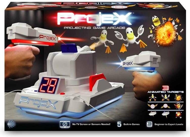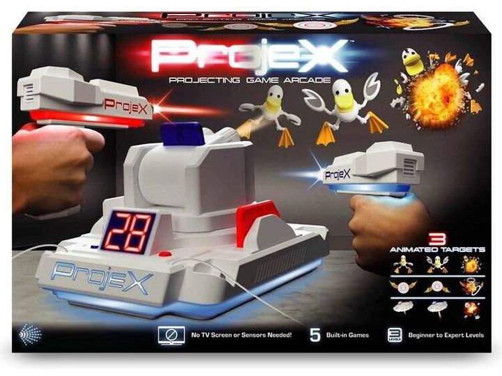 Schalte das Licht aus und schalte das Spiel ein! Richte den ProjeX-Projektor auf eine leere, helle Wand, nimm den Blaster, ziele und schieße auf die Ziele, die an die Wand projiziert werden. Die Ziele bewegen sich, also musst du gut und schnell sein. 3 verschiedene Bildfolien werden mitgeliefert, die Enten, Ziele oder UFOs projizieren, jede mit ihren einzigartigen Soundeffekten. Es gibt 5 verschiedene eingebaute Spiele und 3 Schwierigkeitsstufen, von Anfänger über Fortgeschrittene bis hin zu Experten. Das Set enthält: - 1 ProjeX-Spielgerät - 2 Blaster - 3 Bildfolien - 1 Anleitungsheft