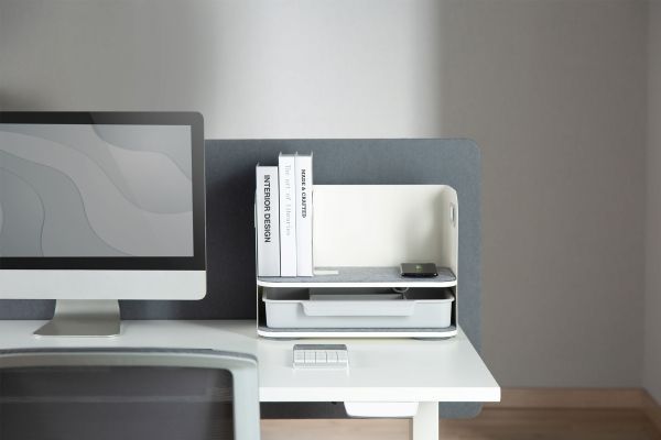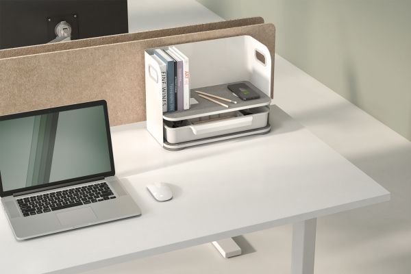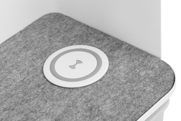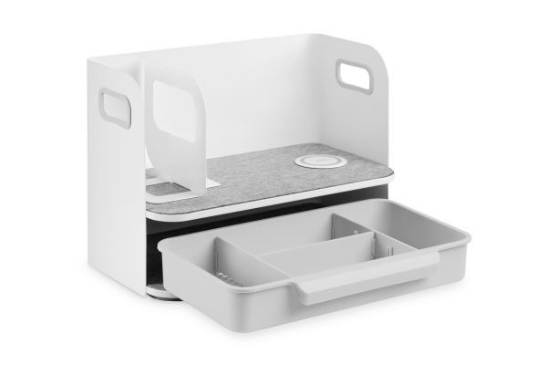 The practical and stylish Desktop organizer with Qi charger ensures a tidy workplace. It also offers a Qi charger for smartphones. In addition to the elegant design, it offers a practical storage area for documents, books, etc. as well as a drawer in which the subdivisions can be customized. The storage areas are fitted with a stylish felt surface.