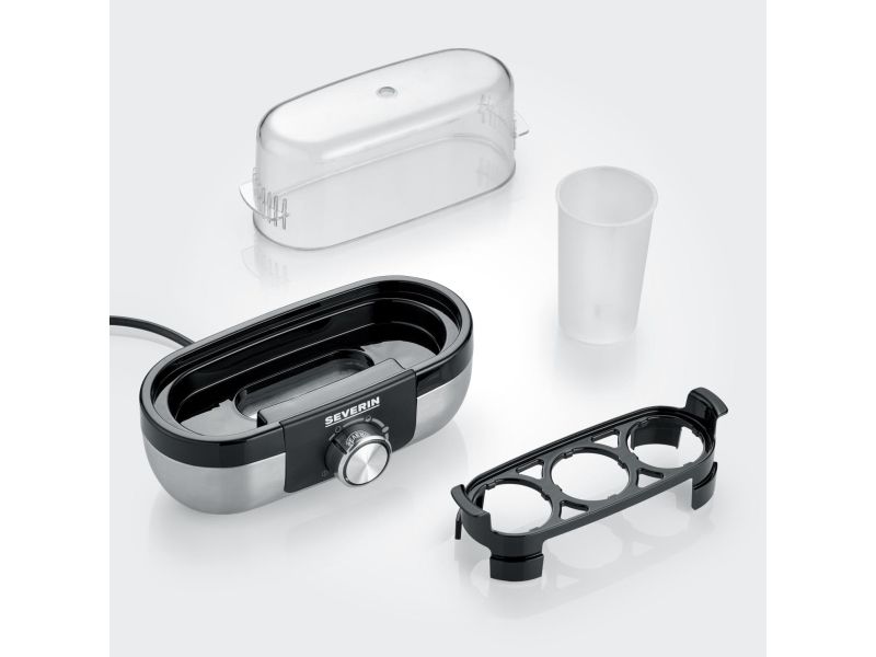 EK 3163 æggekoger med overvågning via kogepladeAftagelig og gennemsigtig hætte for nem betjening og rengøring Indstillelig hårdhedsgrad med elektronisk overvågning af kogetiden og signaltone efter endt tilberedningstid Pladsbesparende og førsteklasses design af rustfrit stål til op til 3 ægDen perfekte æggekoger til små husholdninger. Med EK 3163 i eksklusivt design i rustfrit stål kan der nemt koges op til 3 æg samtidig. Den elektroniske tilberedningstidsovervågning muliggør en nem og individuel indstilling af den ønskede hårdhedsgrad - en milliliternøjagtig måling af vand hører således fortiden til! Den transparente og aftagelige hætte letter rengøringen og anvendelsen af 100% BPA-frie materialer og garanterer en sikker nydelse. Målebæger med æggestikker medfølger.