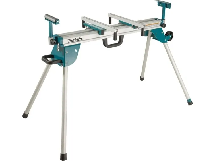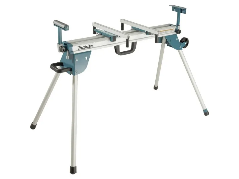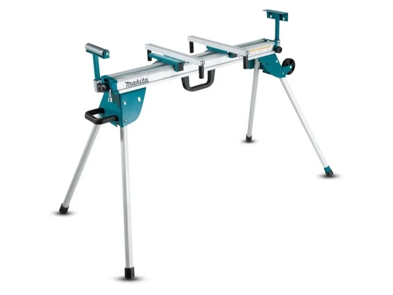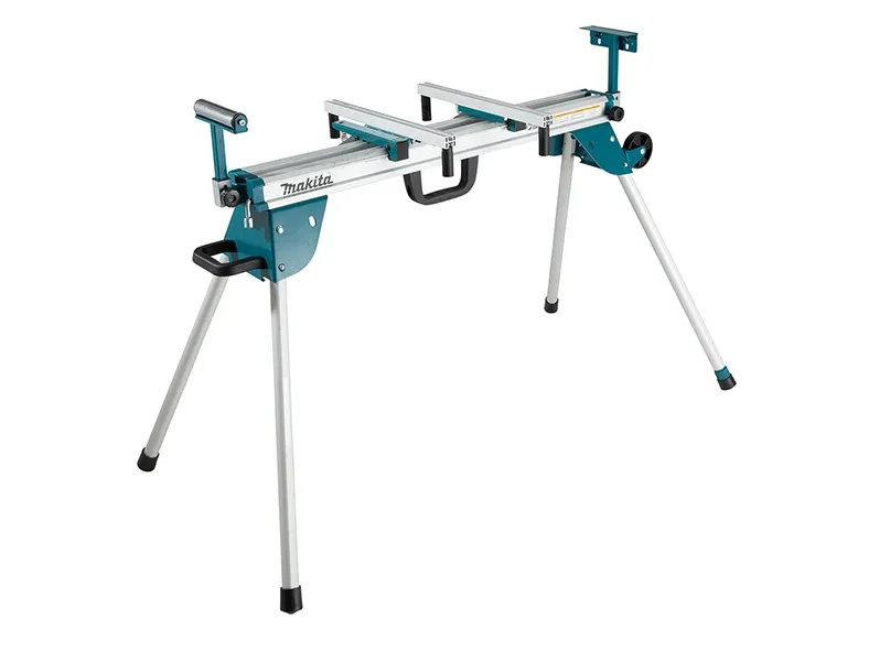 A mitre saw stand for professional use with legs that fold underneath for easy storage and transport. Equipped with a carry handle and wheels for transport.