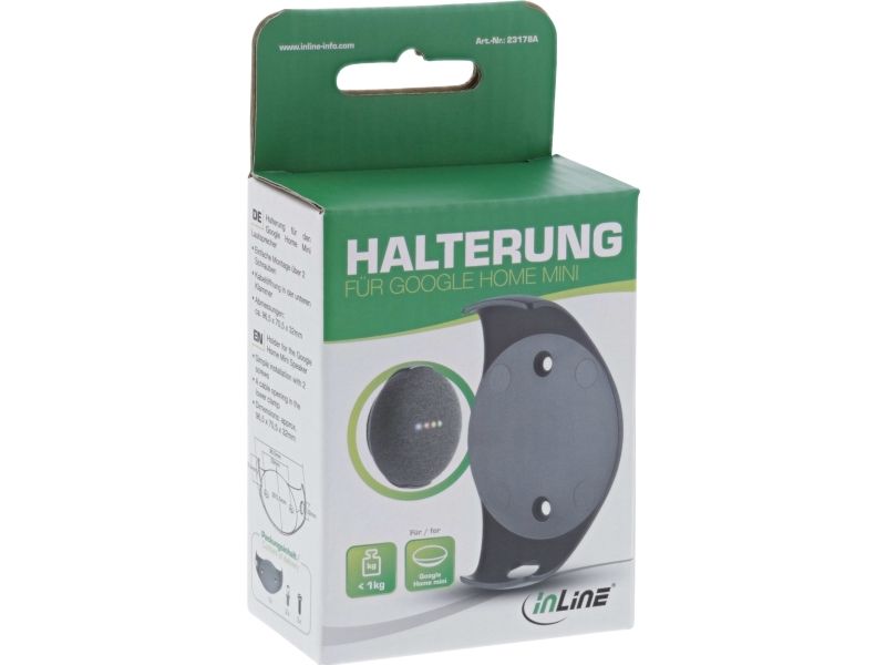 Holder for the Google Home Mini SpeakerContent of delivery: 1x holder, 2 screws, 2 anchorsInLine Wall mount for Google Home Mini. Mobile device type: Portable speaker, Type: Passive holder, Proper use: Indoor, Product colour: Black