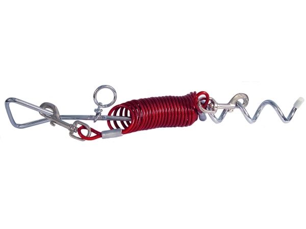 Vinylbeschichtetes Kabel mit Erdspieß. Schrauben Sie den Erdspieß in den Boden und befestigen Sie die Leine an der Schlaufe, dann befestigen Sie den Hund an der Leine. Denken Sie daran, den Hund nie unbeaufsichtigt zu lassen.