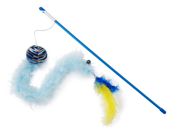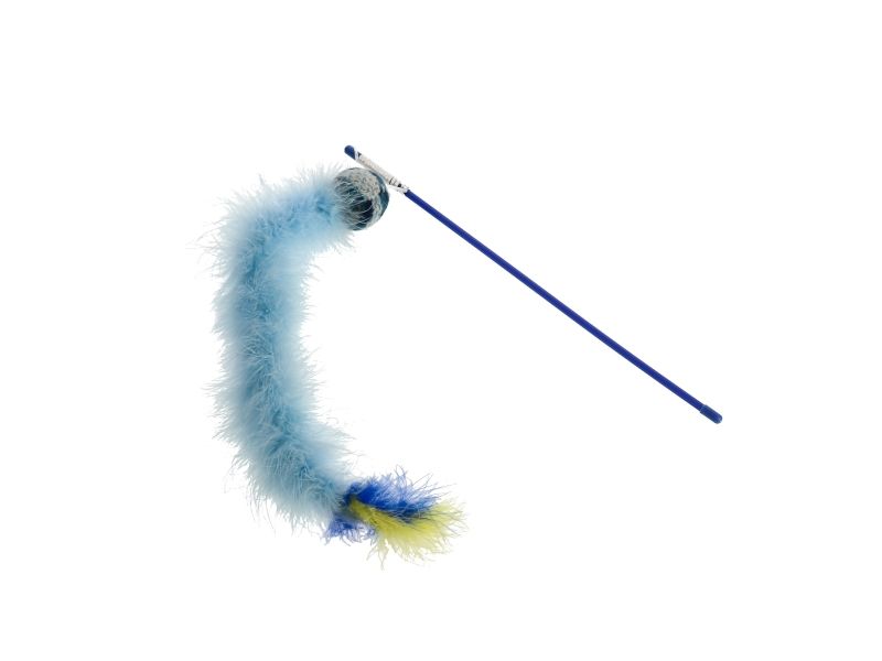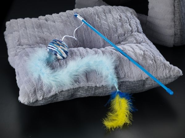 Rosa Katzenrute mit Fleeceball und langem Plüschschwanz. Am Ende des Schwanzes befindet sich eine Nadel. Das Spielzeug enthält Katzenminze.