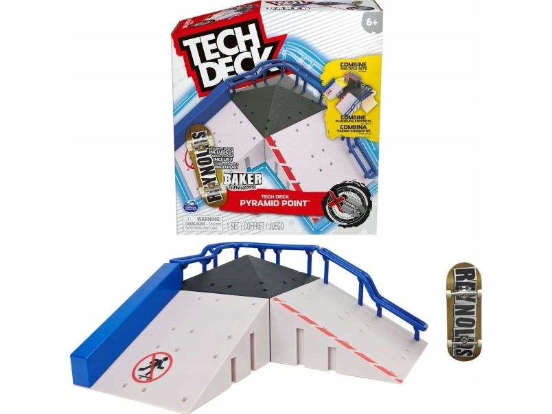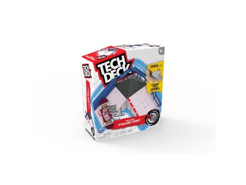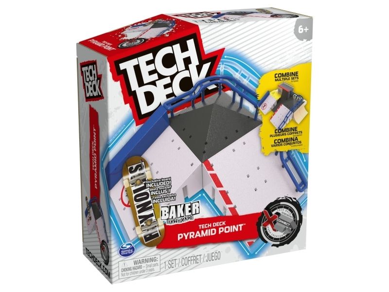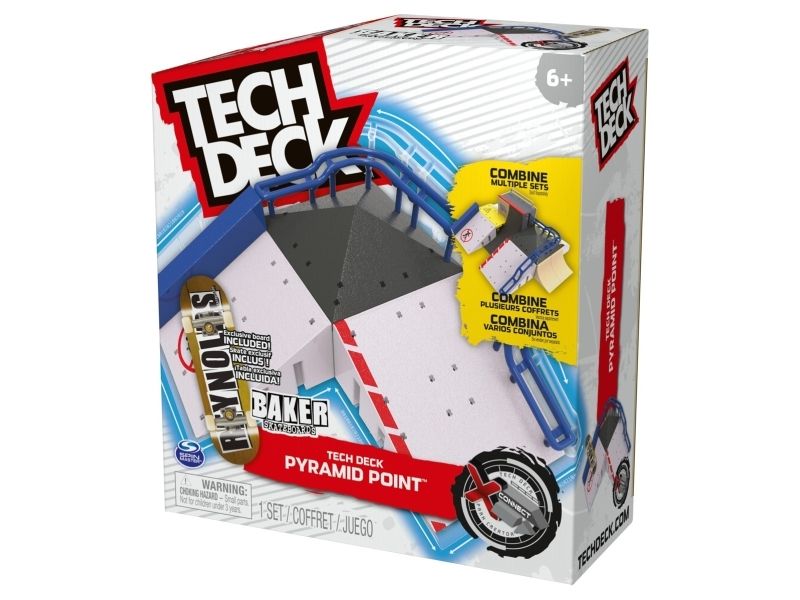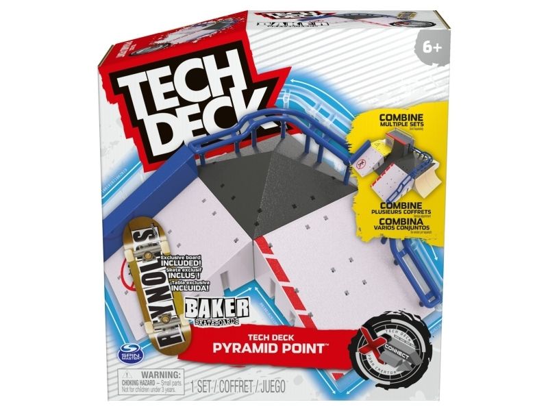 Grab some air with Tech Deck, the real deal fingerboards featuring authentic graphics from real skate companies! The Pyramid Point X-Connect Park Creator ramp set includes everything you need to build an awesome custom park for you to perfect your finger skateboard skills. Set up different combinations with the ramps, pyramid top, and bubba ledge to learn and progress your tricks. Ride the curved rail, jump the pyramid top, slide the Hubba ledge, or set up and customise the spot in any way you like. Skate the park with the included exclusive Baker Skateboards pro fingerboard and add to your mini skateboard collection. Combine the park with other X-Connect compatible ramps, such as the Big Vert Wall and Power Flippin (each sold separately) to build the ultimate fingerboard park for you to shred. Use the Pyramid Point X-Connect Park Creator with your Tech Deck fingerboard collection (each sold separately). There are a ton of Decks, toy figures & playsets to collect! Ride, flip, and grind with Tech Deck fingerboards from real skate companies! Tech Deck mini skateboards for fingers and ramp sets make the perfect gift for girls toys age 6-8 who love small toys and cool toys or as an alternative to toy cars as a boys toys age 6-8 item. If you want real skate graphics from real skate companies, then it has got to be Tech Deck — start small, go big and collect them all.