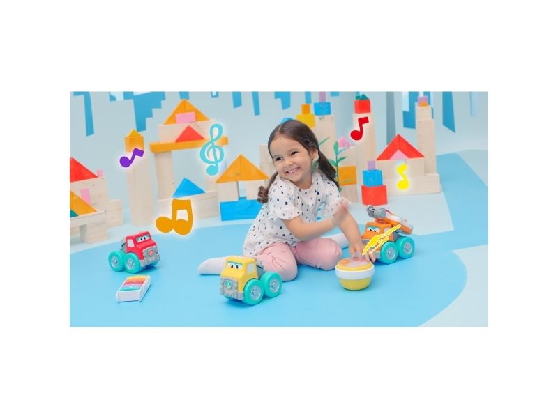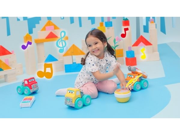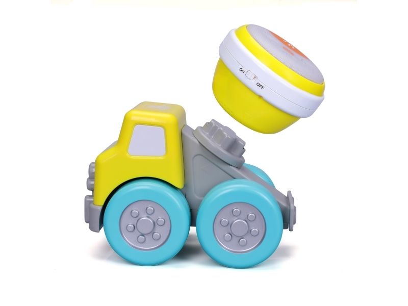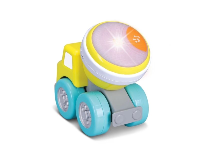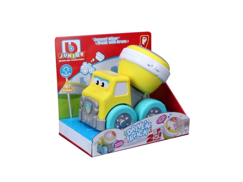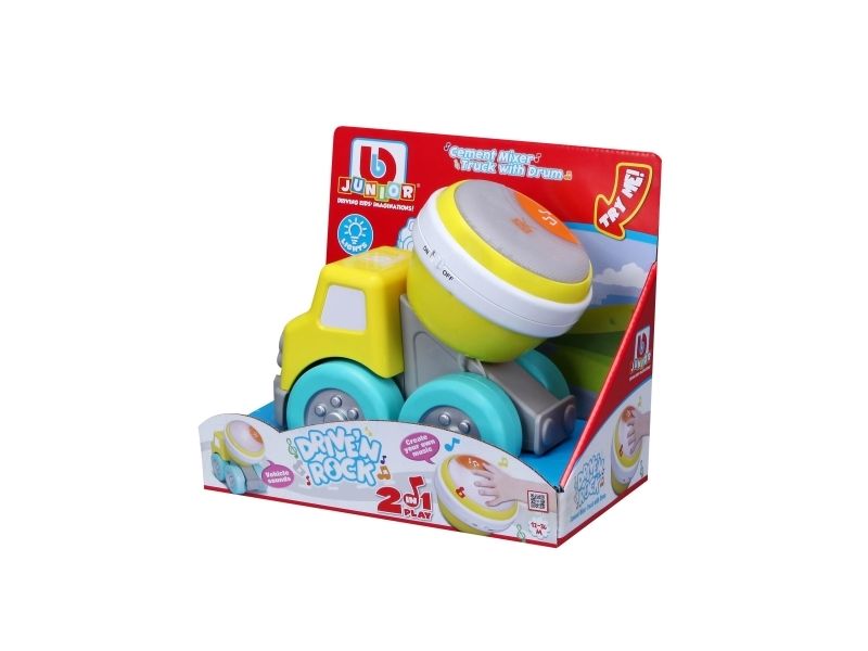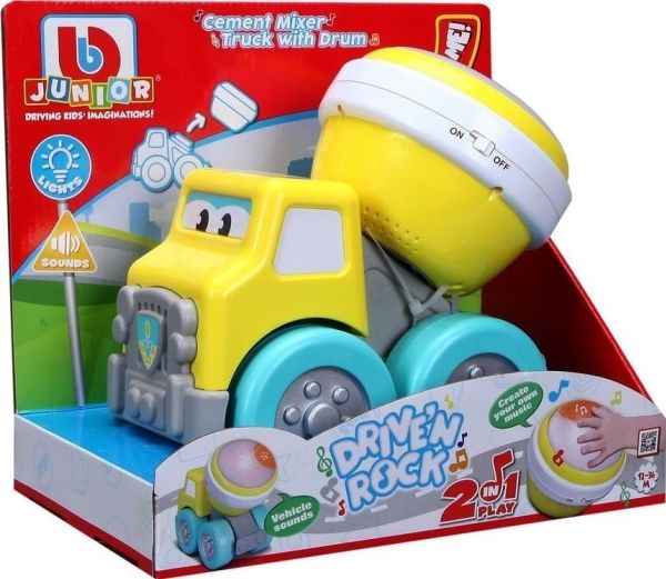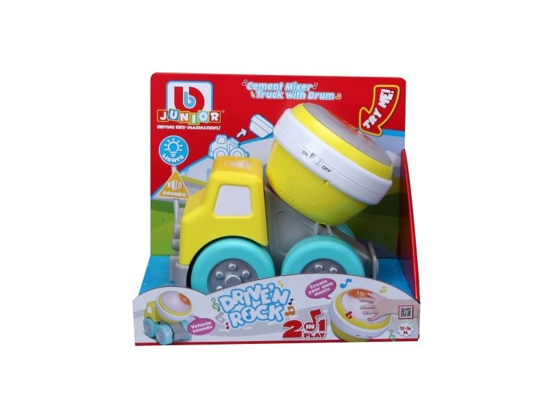 Cement mixer truck with Rock'N Roll drum. This cement mixer truck is part of a travelling band. The truck doubles as fun construction vehicle that sure knows how to Rock 'N Roll with its drum. The drum has 2 play modes: free play or preset melodies. Get ready to Drive 'N Rock. From 12 to 36 months.