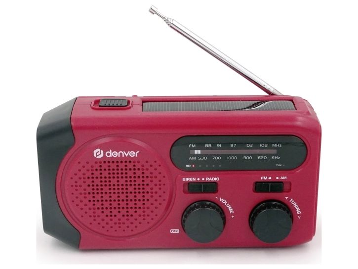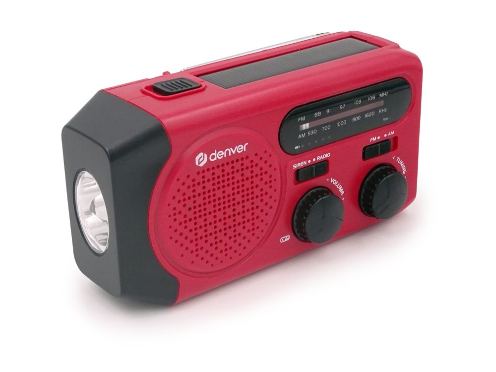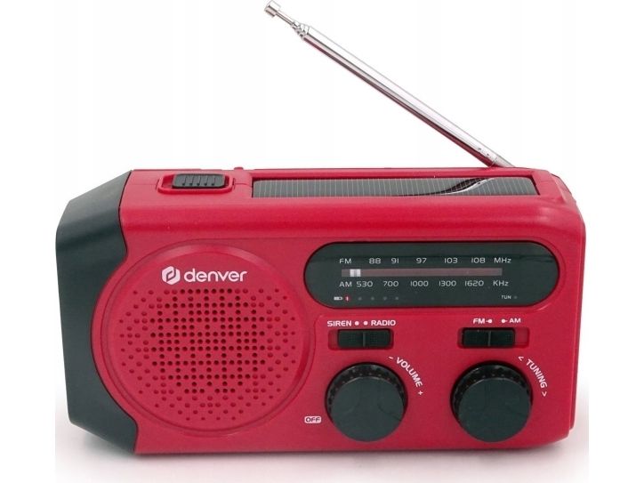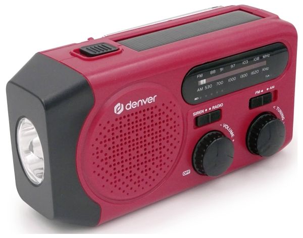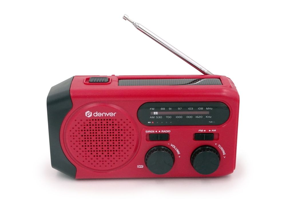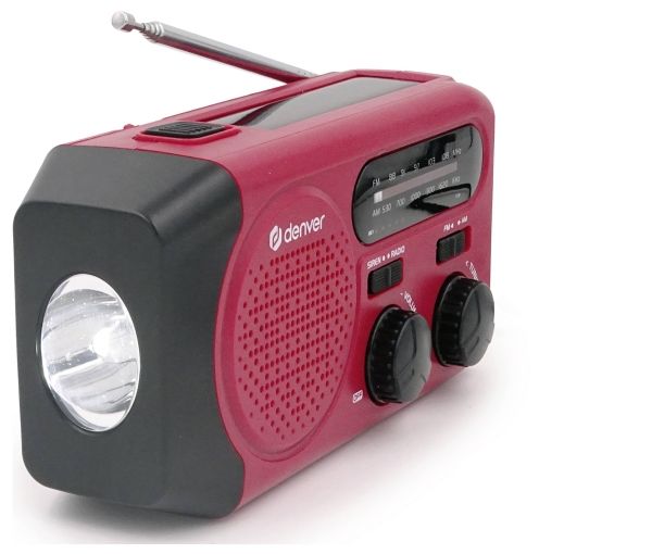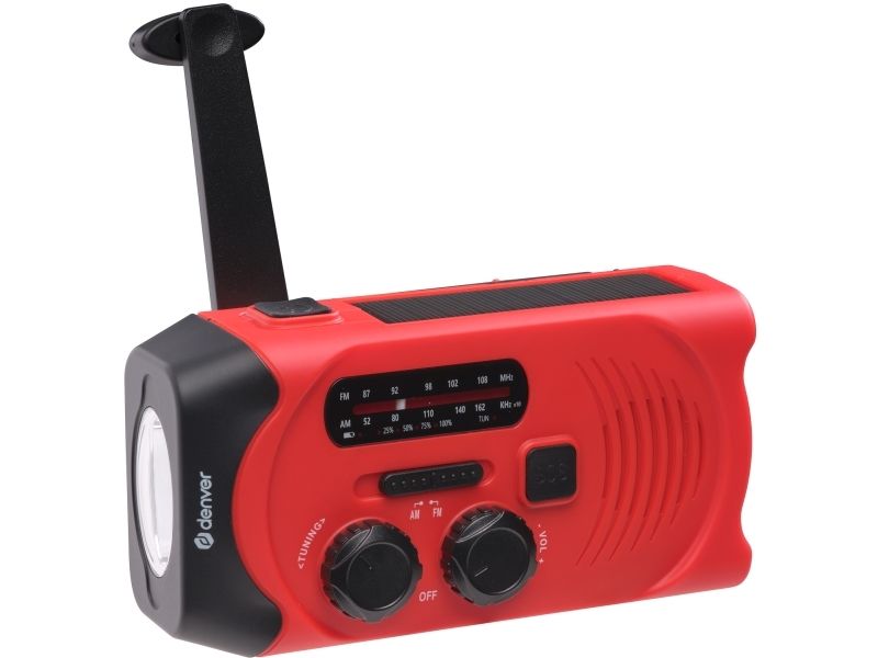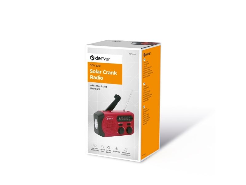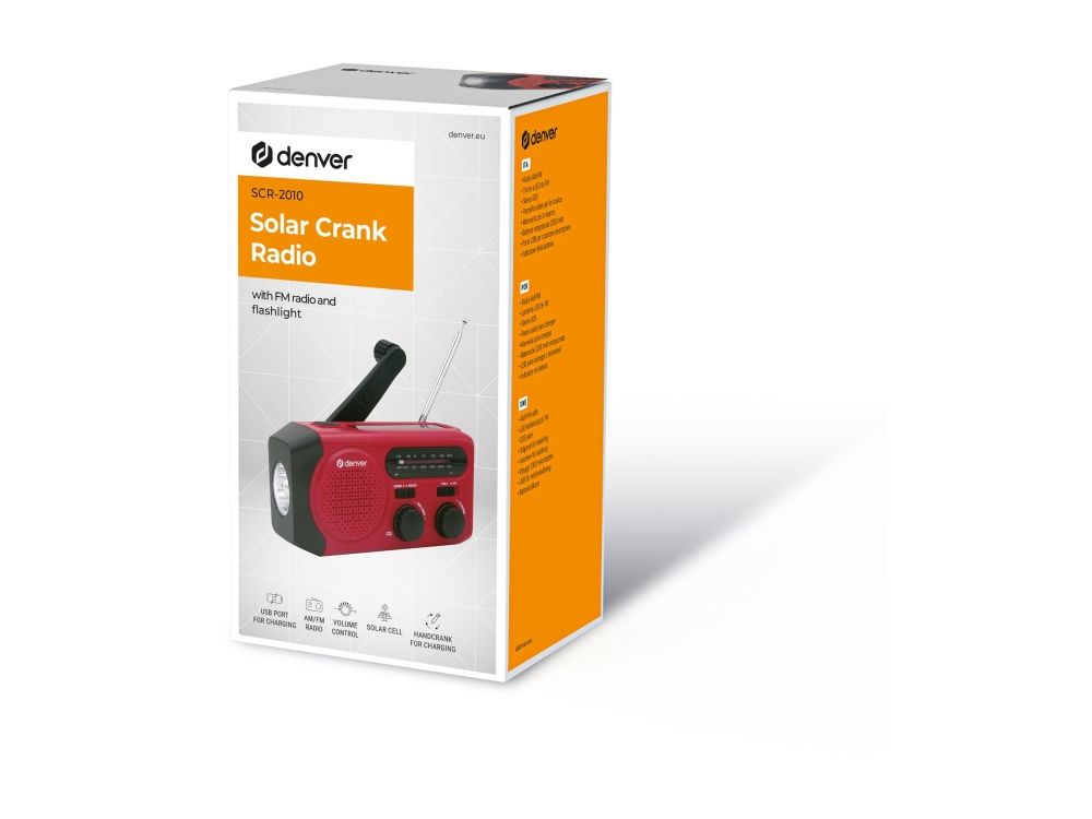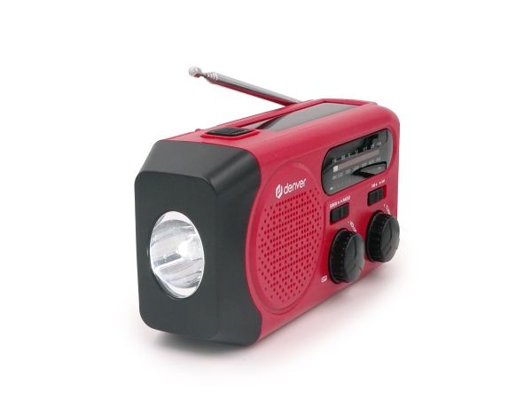 Solar Crank Radio with built-in 2000mAh batteryDenver SCR-2010. Battery capacity: 2000 mAh, Battery technology: Lithium-Ion (Li-Ion), Battery voltage: 3.7 V. USB Type-A output ports: 1. Output current: 1 A. Product colour: Red