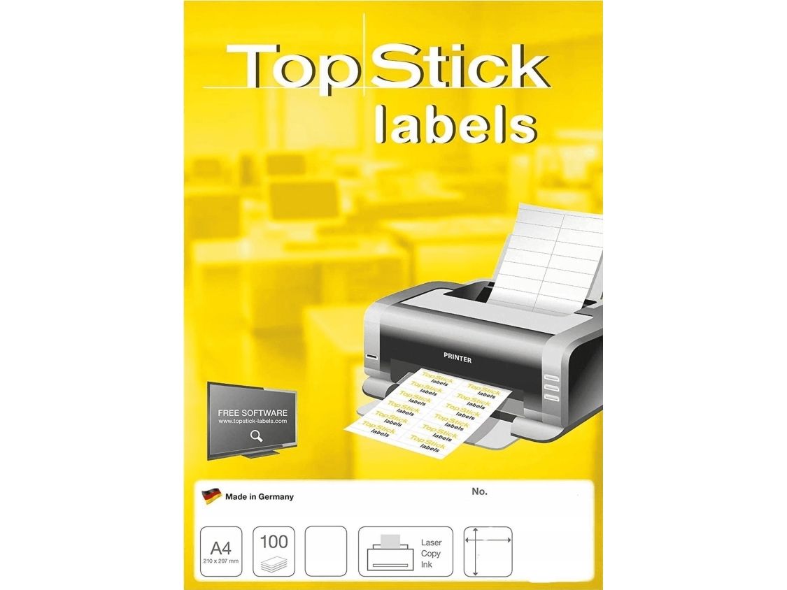 Self-adhesive labels with permanent adhesion, on A4 sheets. For all laser printers, inkjet printers and copiers or for hand lettering. Perfectly flat lay. All-round protective edge protects the printer drum and rollers from adhesive residues. Made of chlorine-free bleached paper with solvent-free adhesive. 67 formats to cover a wide range of applications. Ideal for price tagging and product labelling, for addressing and shipping and perfectly fitting labels for files and CDs.Top Stick 8720. Product colour: White, Label type: Self-adhesive printer label. Label width: 21 cm, Label height: 29.7 cm. Labels per pack: 100 pc(s), Labels per sheet: 1 pc(s)