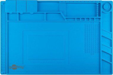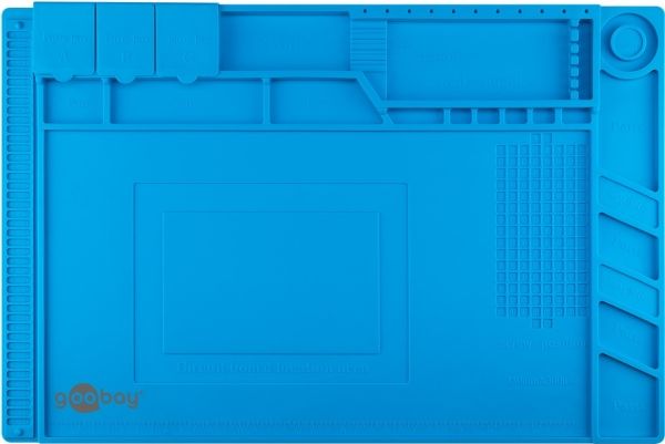 flexible Arbeitsunterlage für sicheres Löten, Reparieren und Basteln Hochwertige Silikonmatte für Lötarbeiten an Platinen, Telefon, Laptop und anderen elektronischen Geräten Rutschfestes Material bietet die perfekte Unterlage für Präzisionsarbeiten wie die Reparatur von Smartphone, Uhr, Brille, Kamera oder Modellbau-Zubehör Geruchsfreie Bastelunterlage ist hitzebeständig bis 450 °C, sodass auch der erwärmte Lötkolben darauf abgelegt werden kann, ohne den Arbeitstisch zu beschädigen 4 magnetische Flächen und 6 praktische Ablagekerben sowie erhöhte Ränder verhindern das Verrutschen von Kleinteilen wie Schrauben und Schraubendrehern 3 nummerierte Fächer mit Deckel ermöglichen eine einfache Organisation von Kleinteilen und Zubehör Integriertes Lineal an der unteren Kante der Arbeitsmatte erleichtert exaktes Arbeiten (Einheit: Zentimeter) Abmessungen: 450 mm x 300 mm x 6 mm, Lieferung im flachen, ungefalteten Zustand